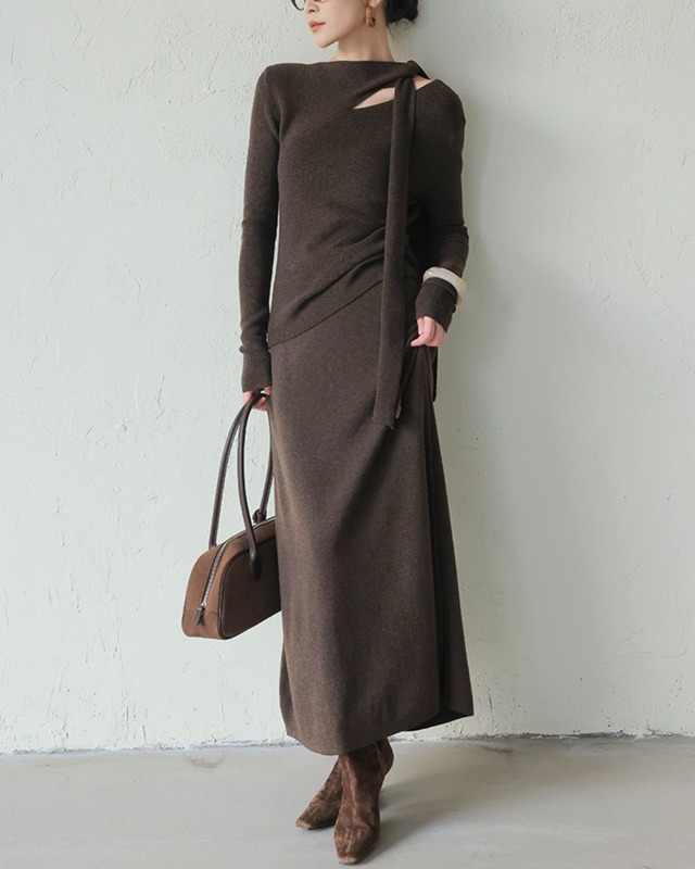 ハイネックスリーブニット×ロングスカートセットアップ V10113