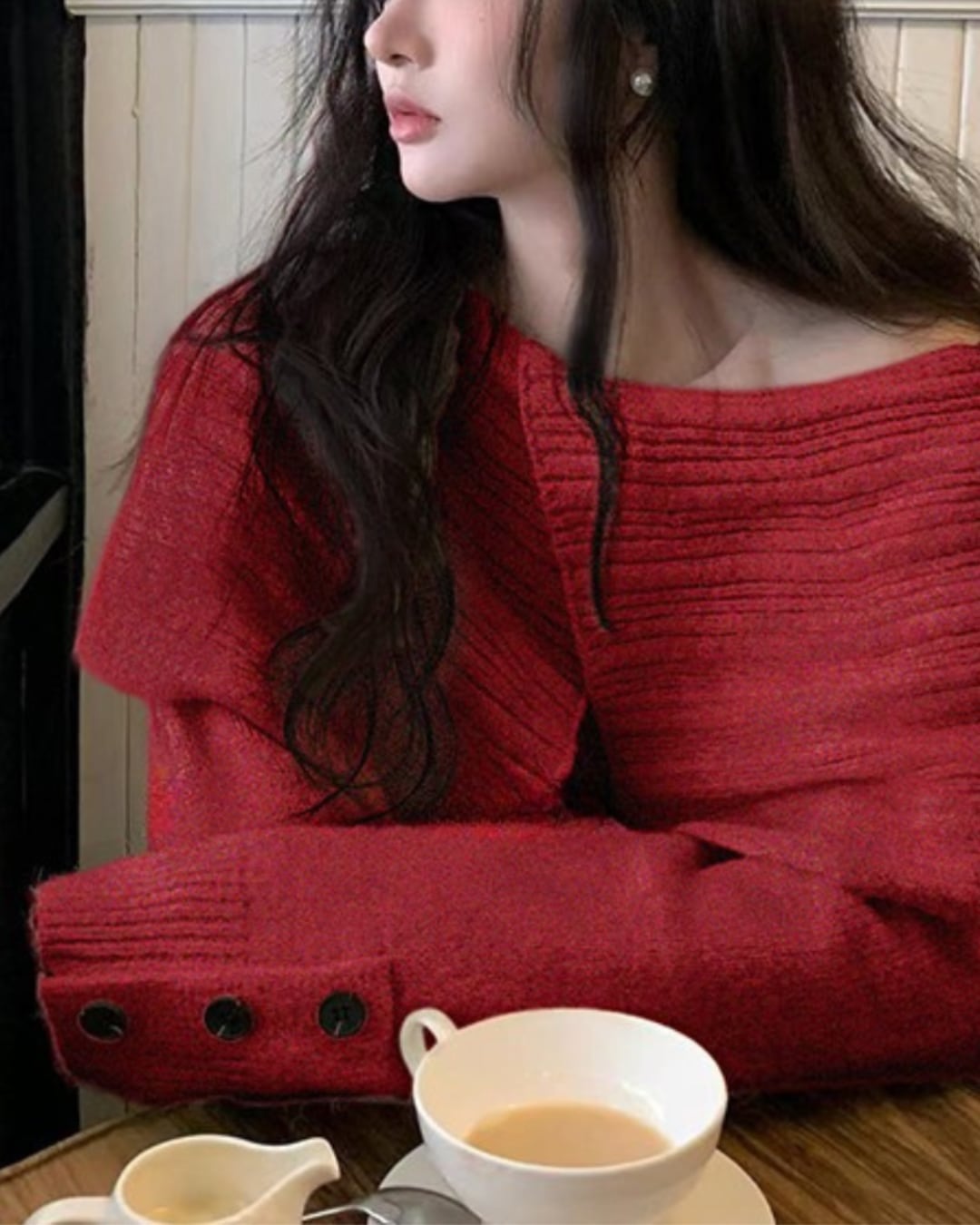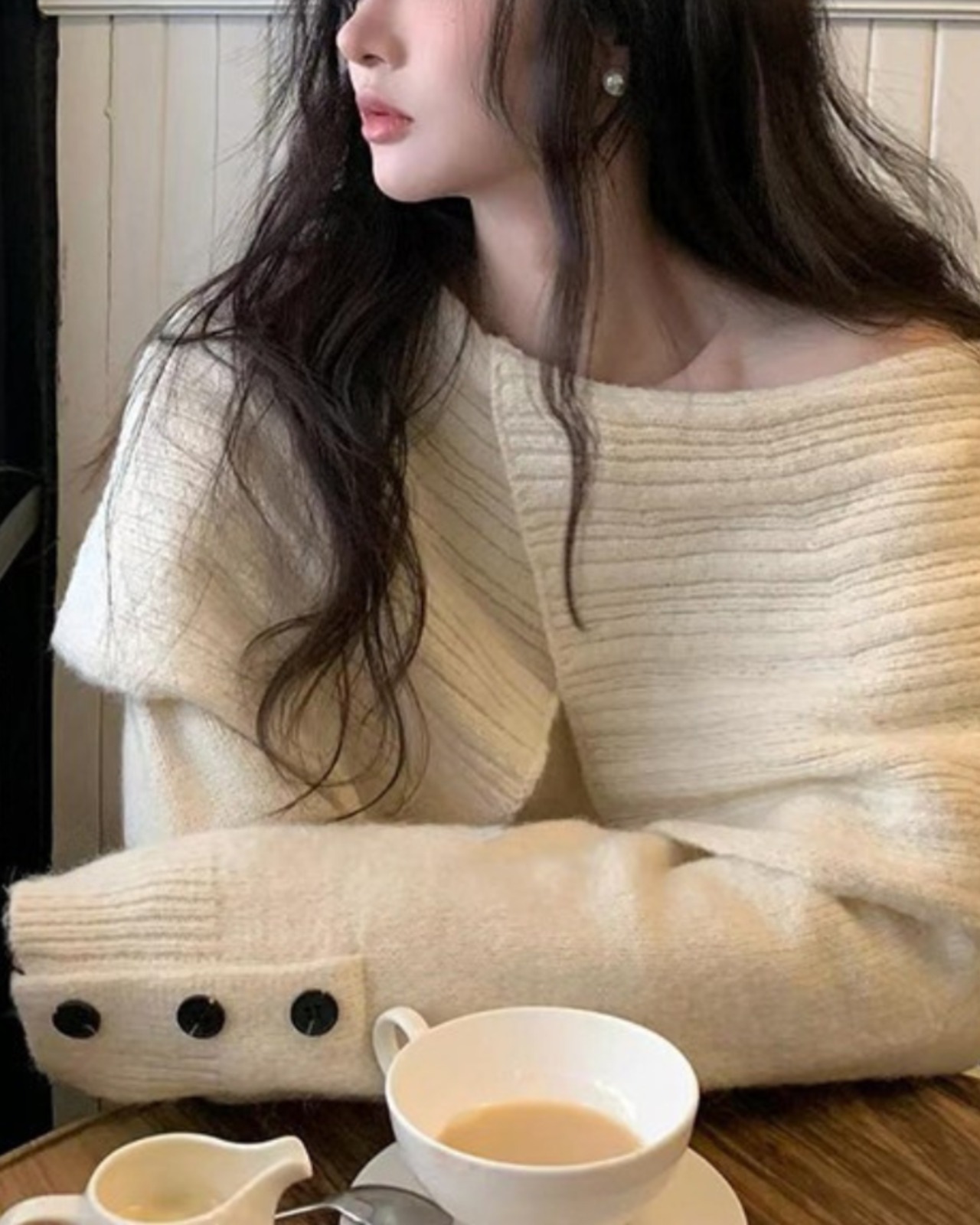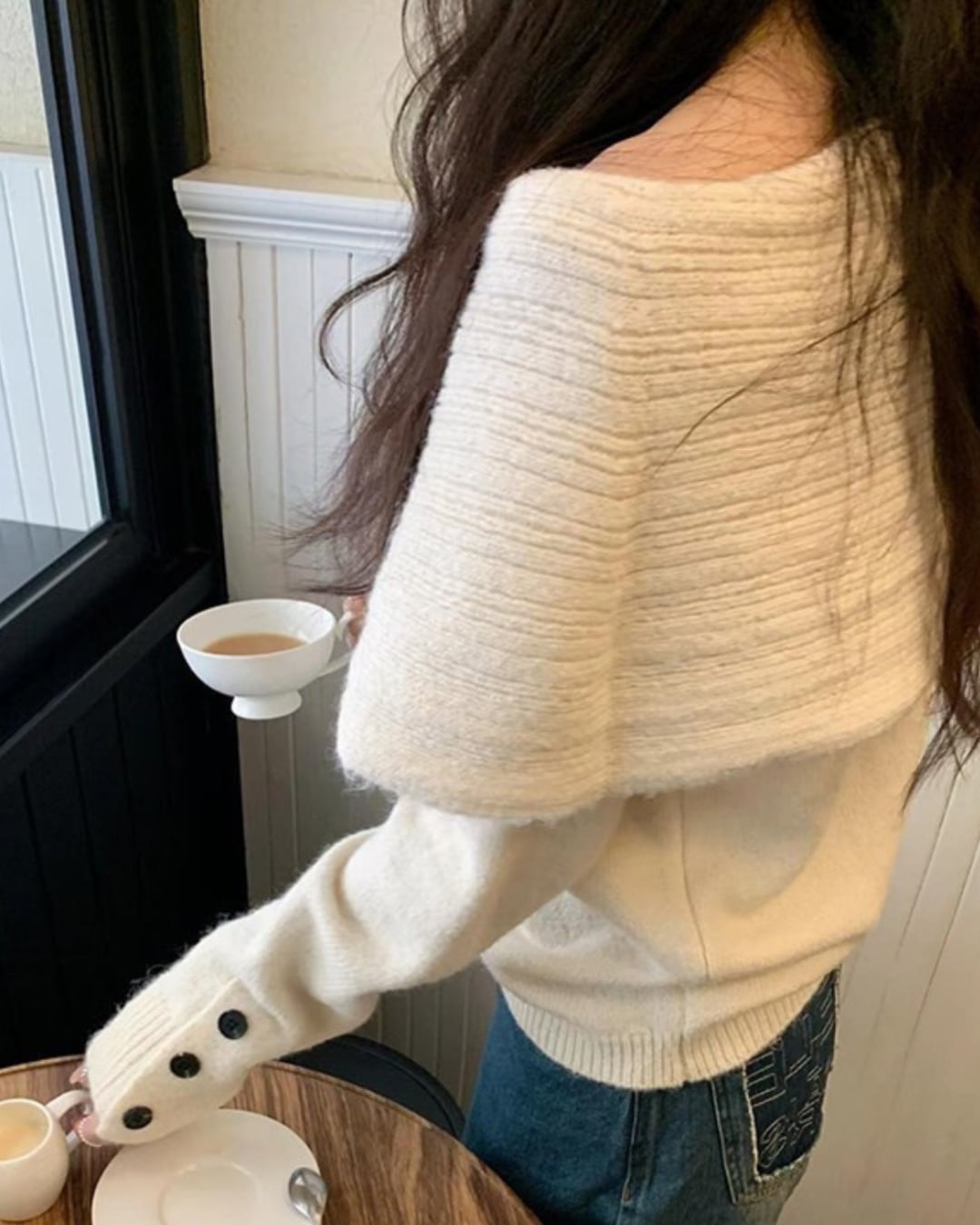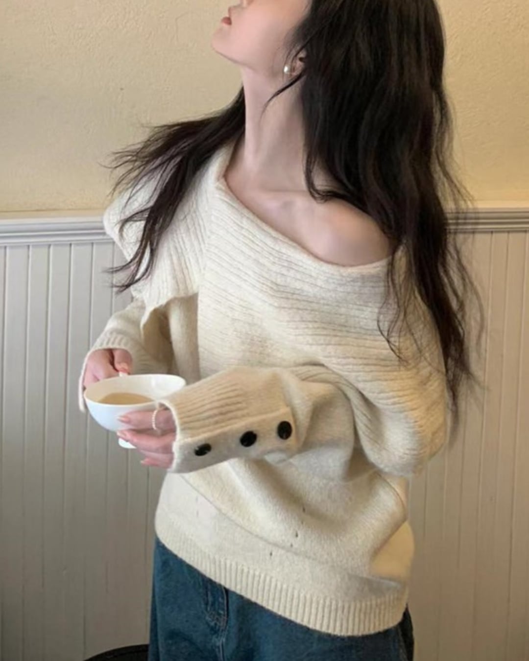 #オフショル風ニット #ボタン袖 #リブニット #フェミニンコーデ #秋冬トップス #着映えアイテム