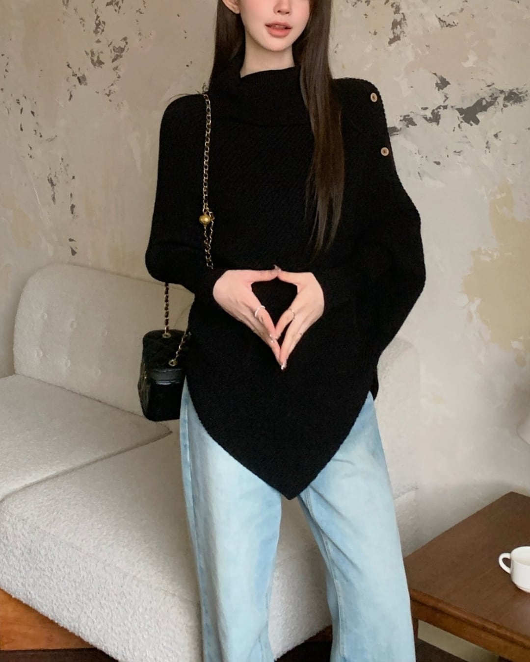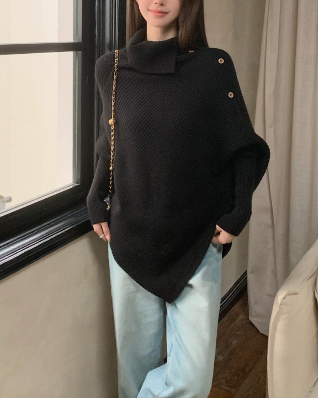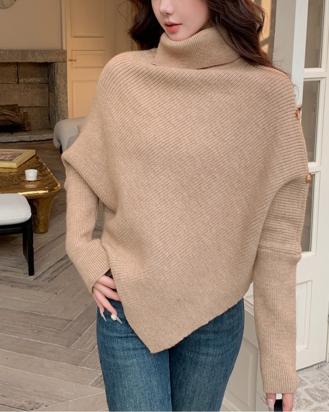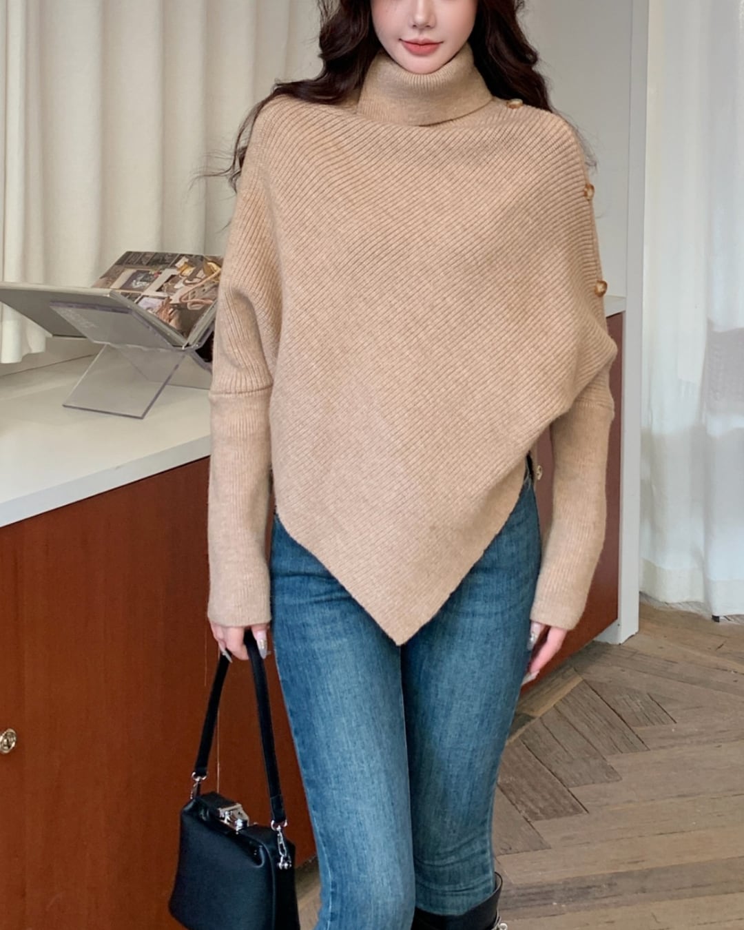#アシンメトリー #ハイネック #ボタンデザイン #ゆったりシルエット #ニットトップス #秋冬コーデ