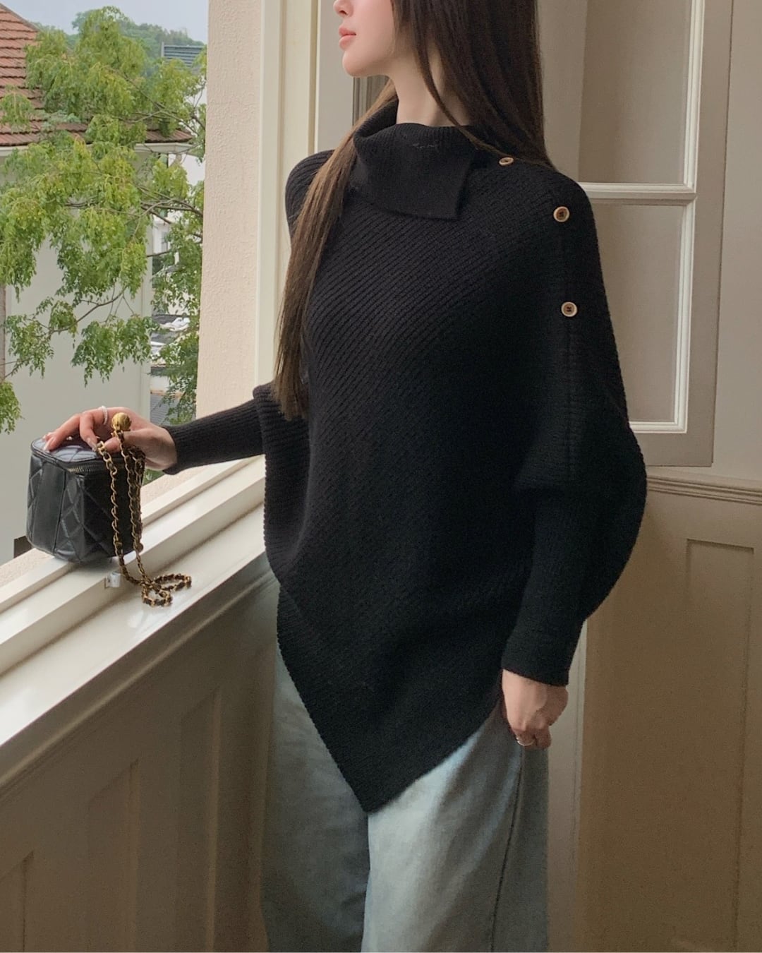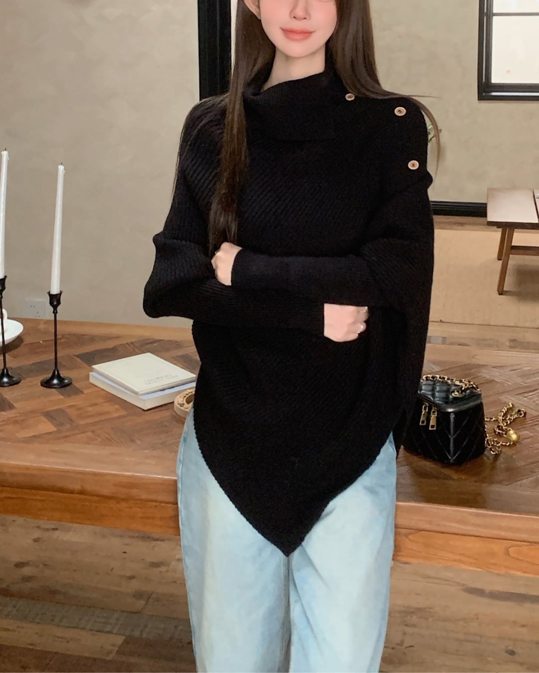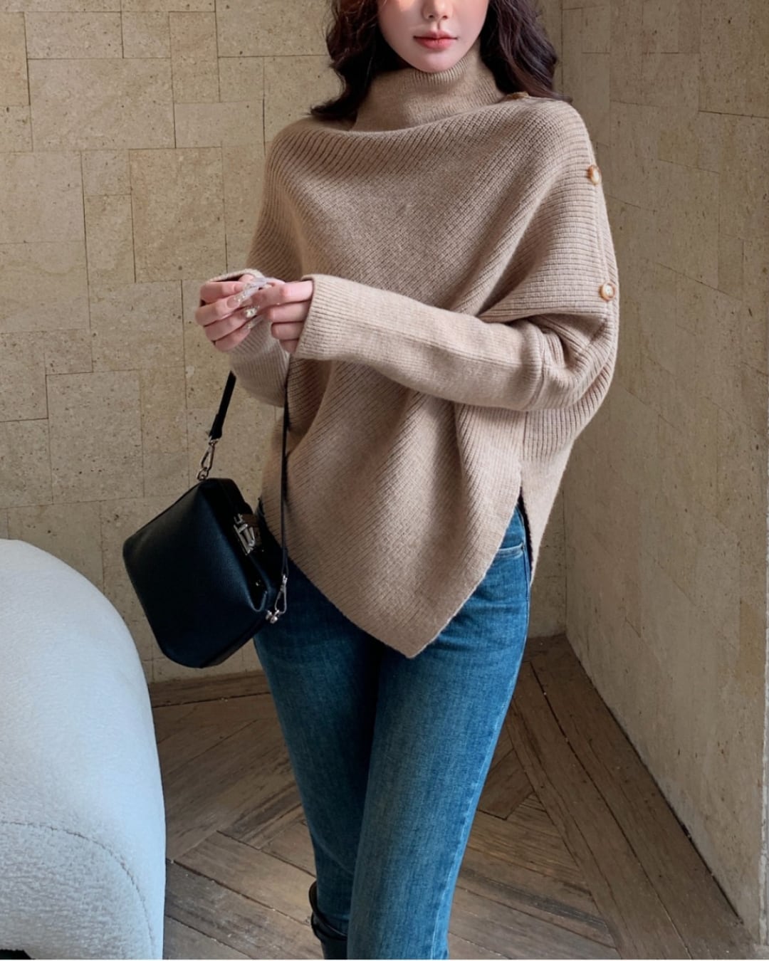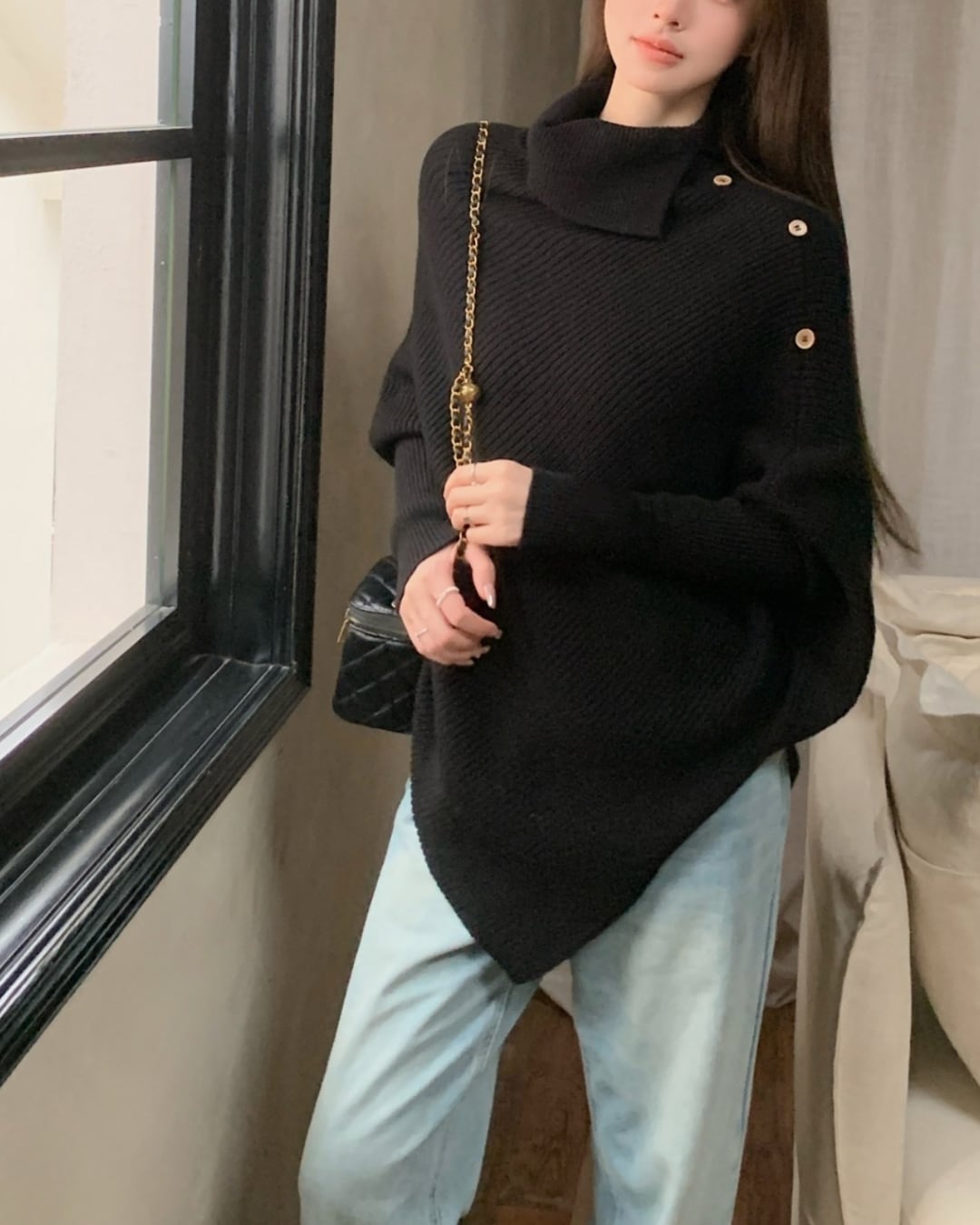 #アシンメトリー #ハイネック #ボタンデザイン #ゆったりシルエット #ニットトップス #秋冬コーデ