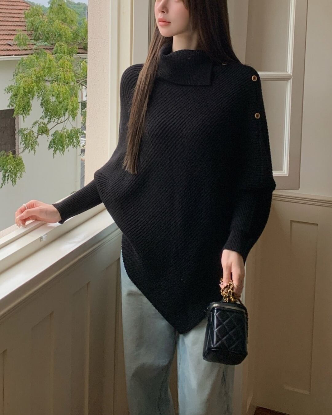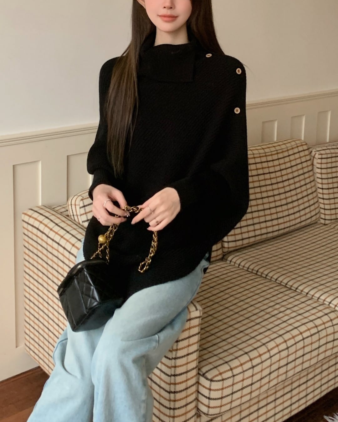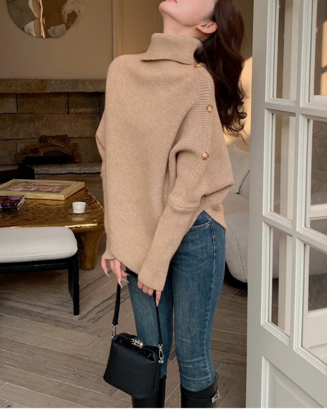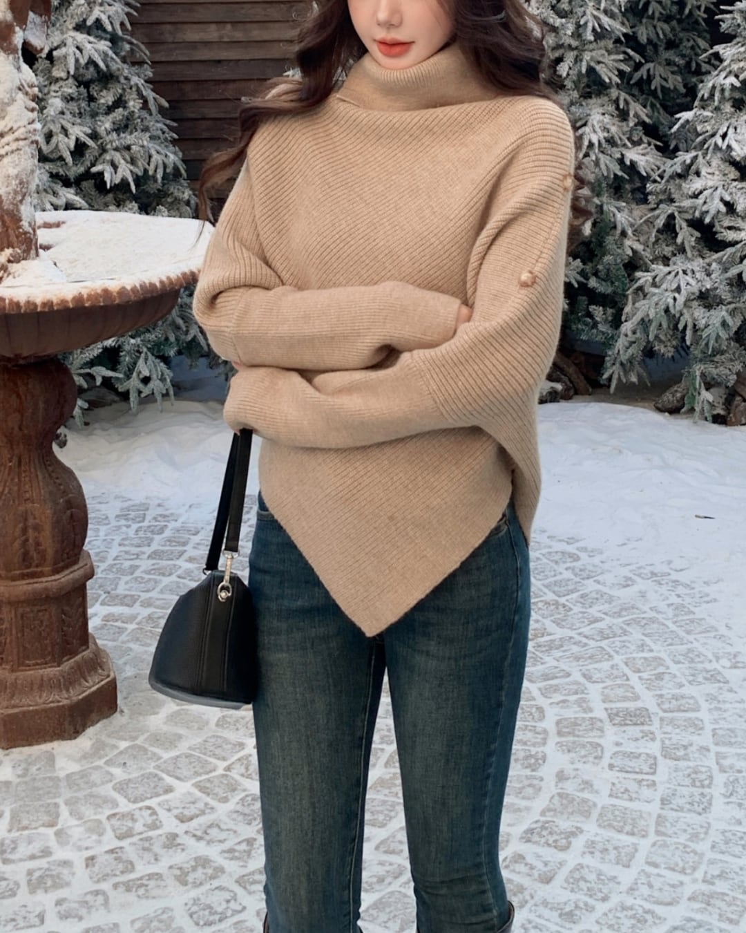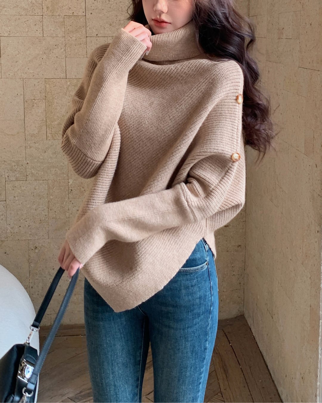 #アシンメトリー #ハイネック #ボタンデザイン #ゆったりシルエット #ニットトップス #秋冬コーデ