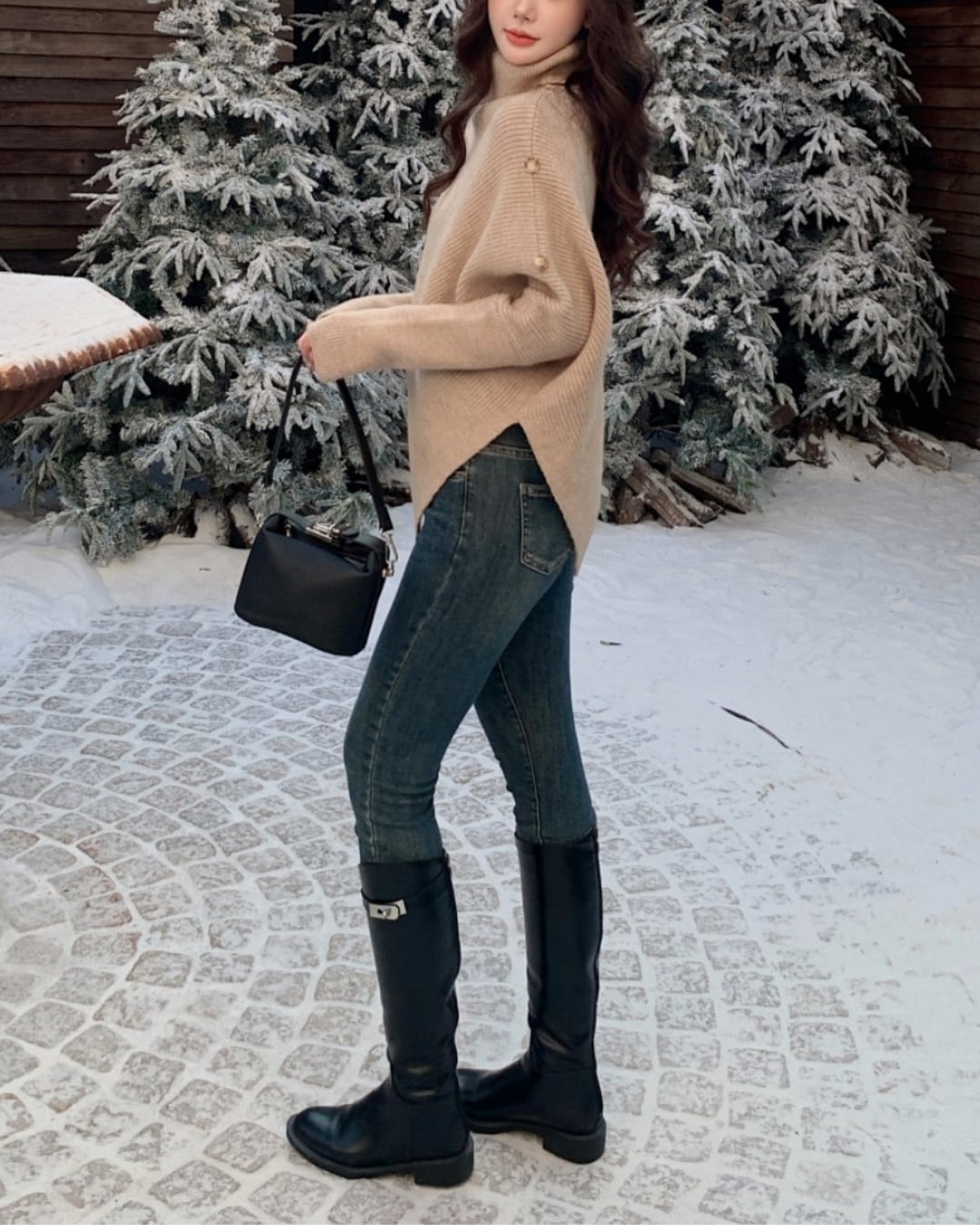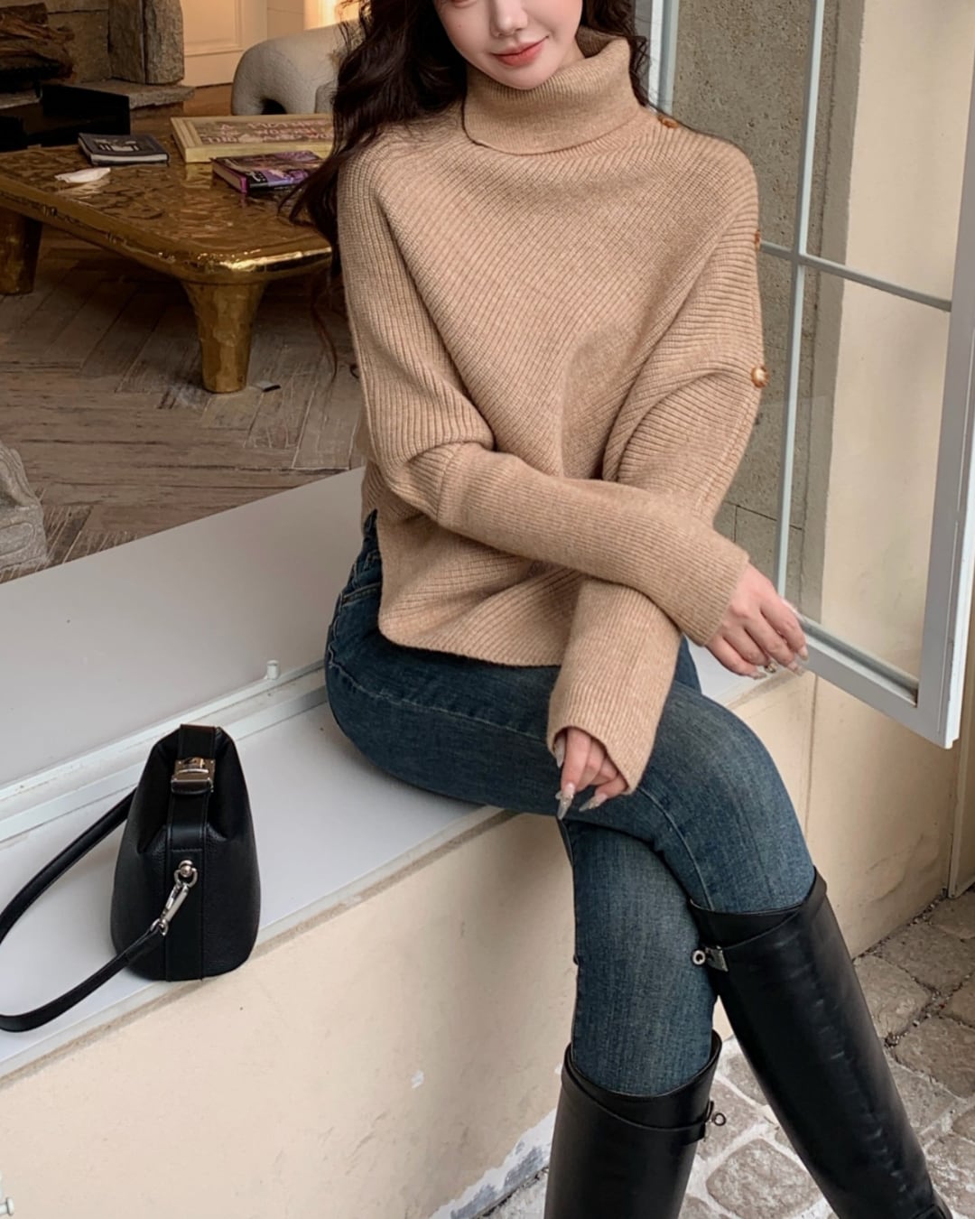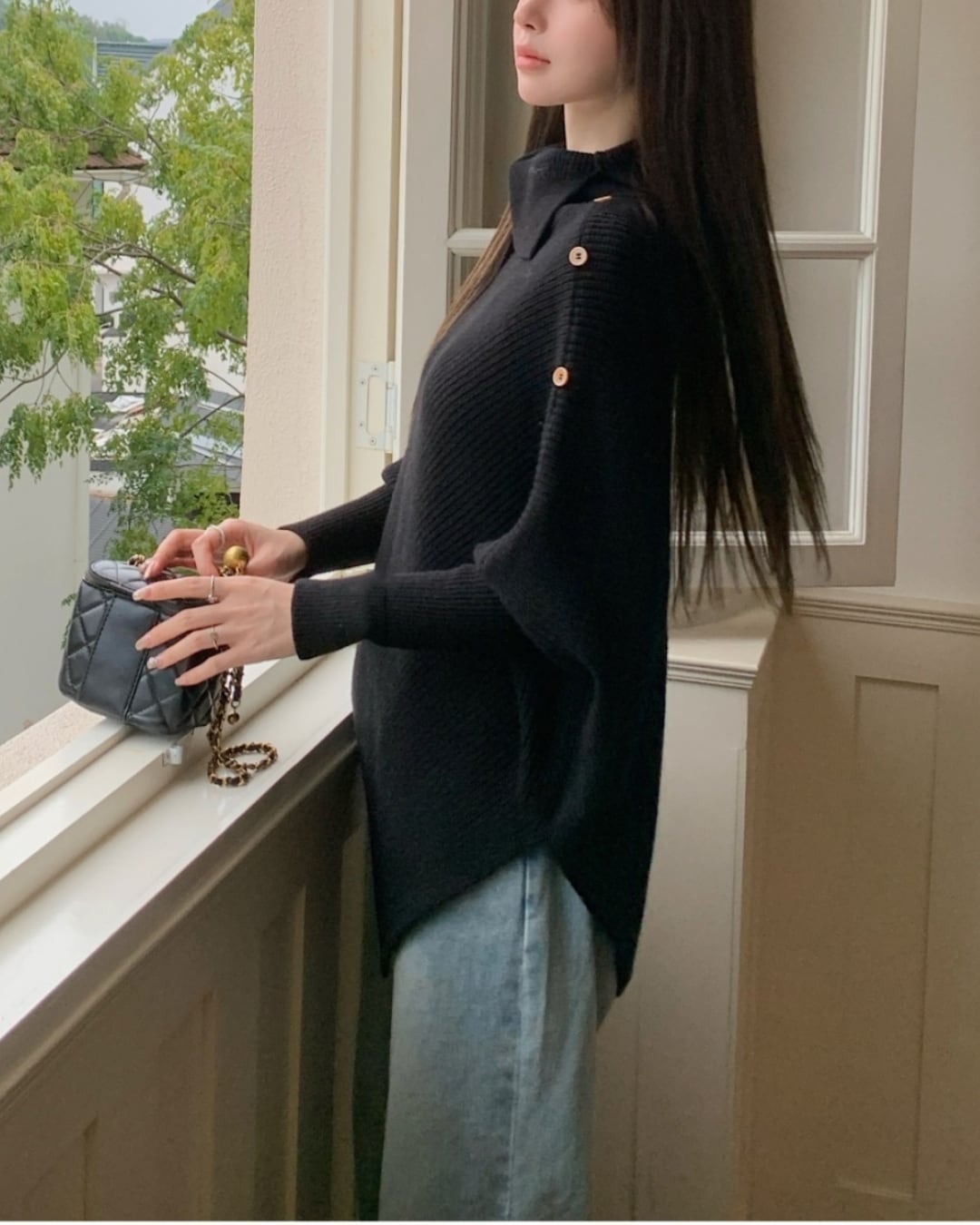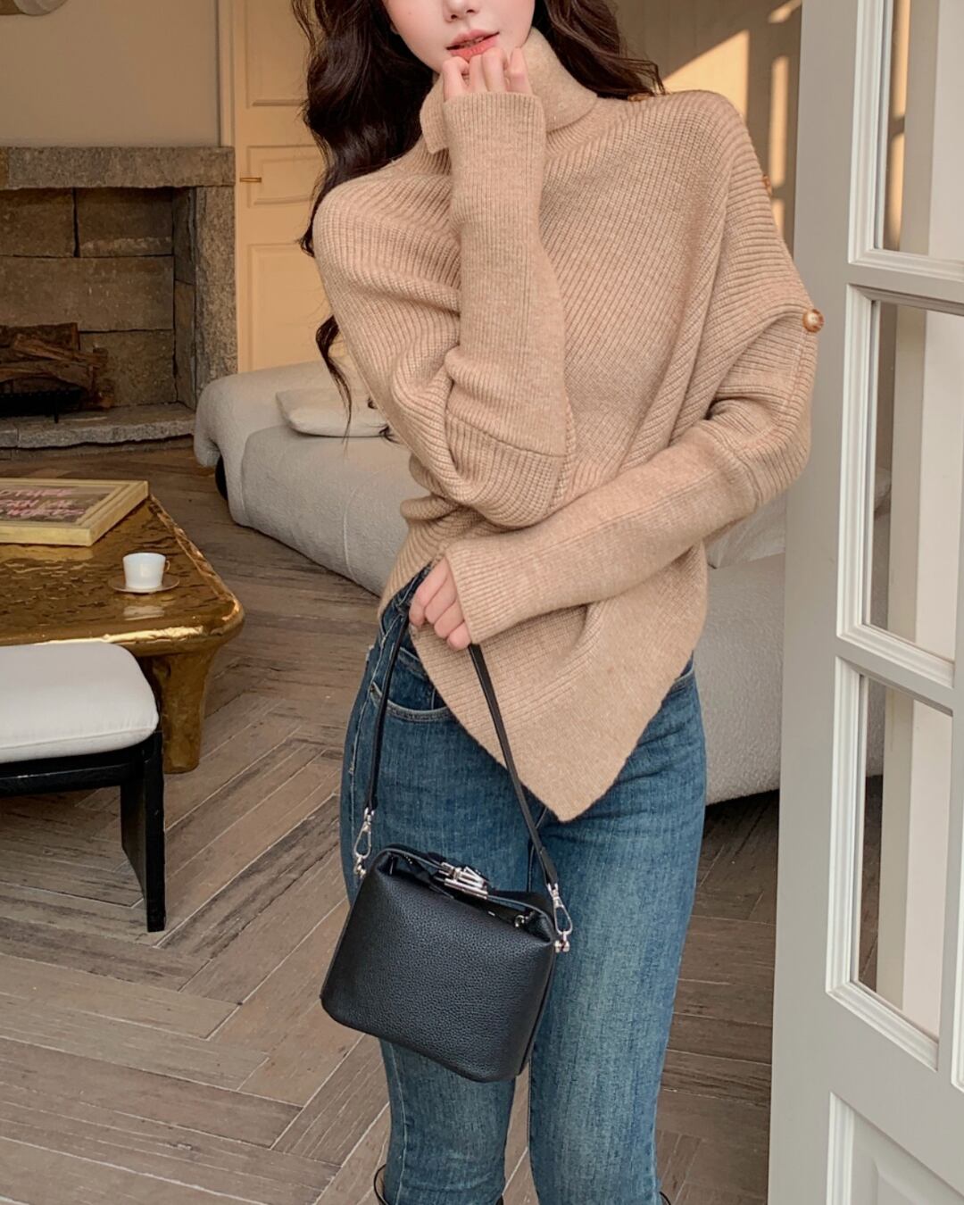#アシンメトリー #ハイネック #ボタンデザイン #ゆったりシルエット #ニットトップス #秋冬コーデ