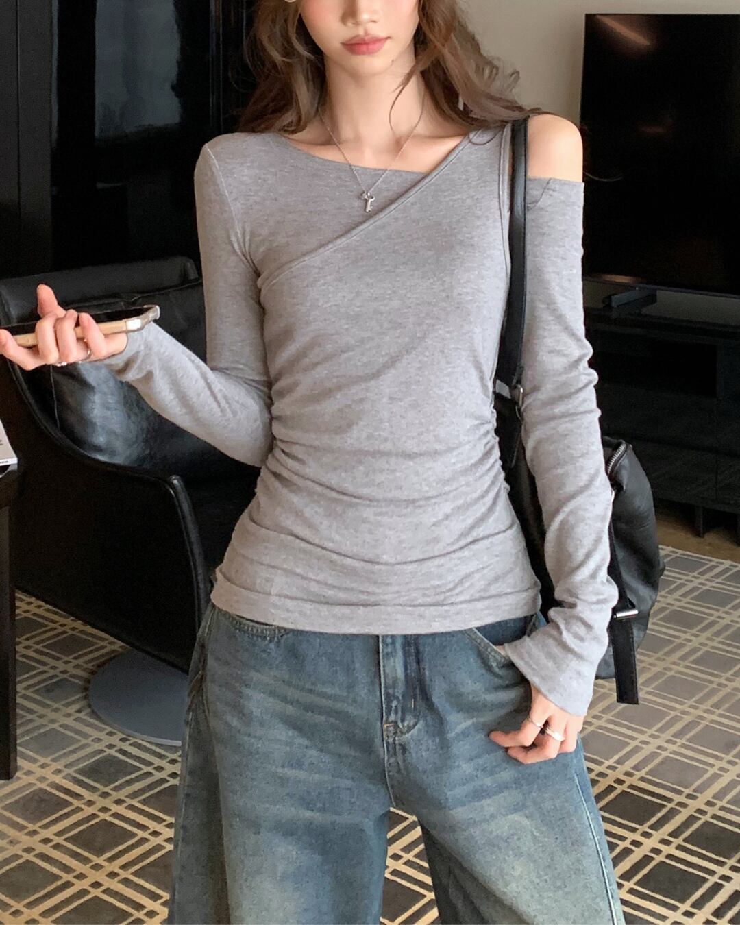 アシンメトリーオフショルロングスリーブトップス V10033