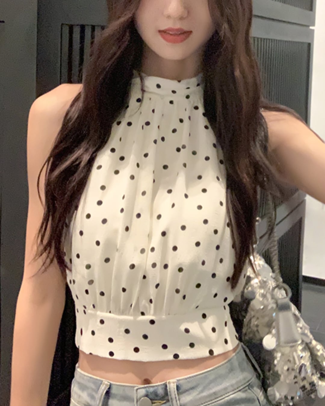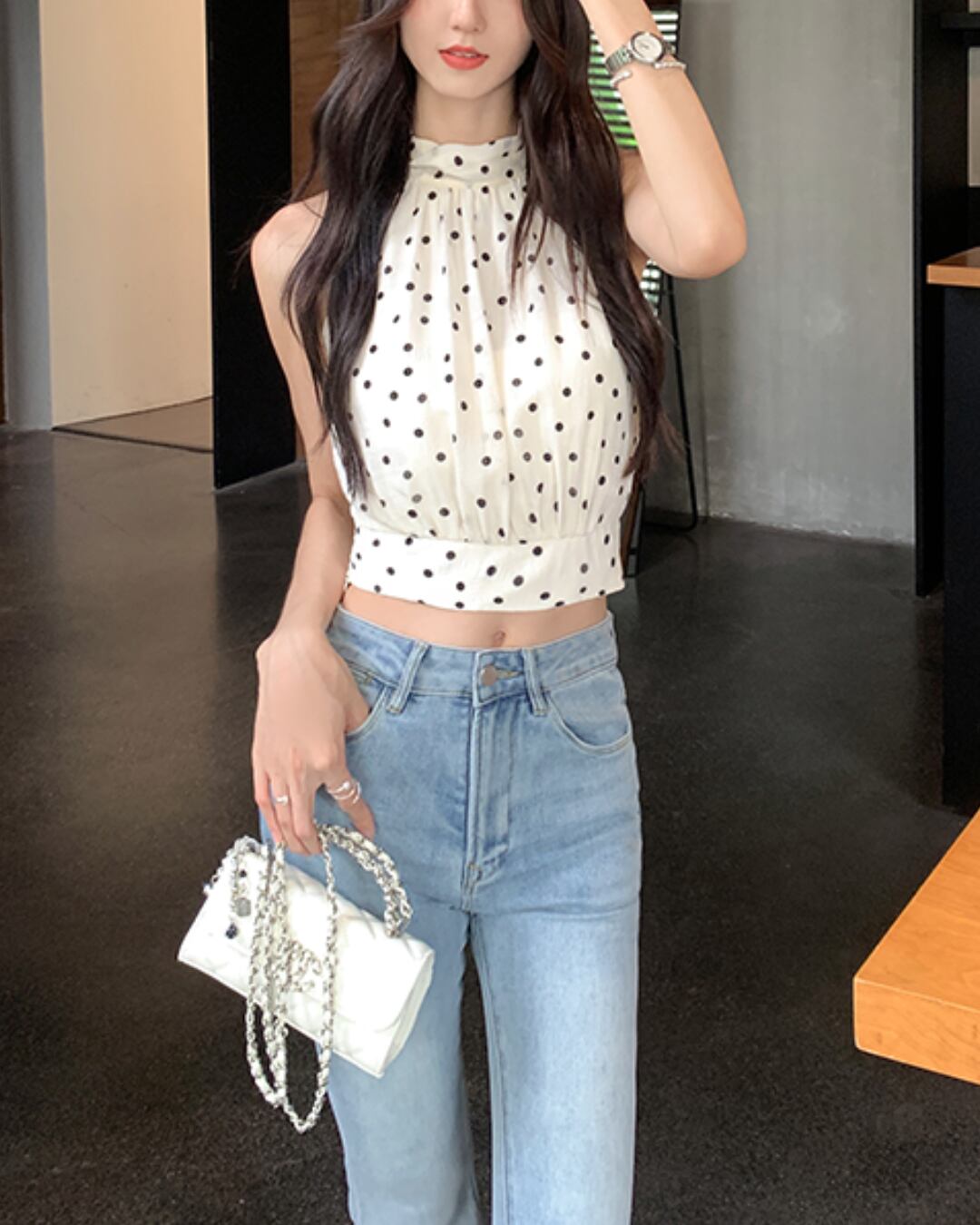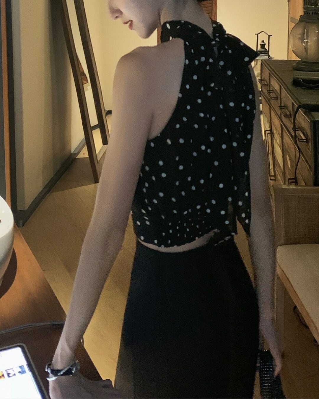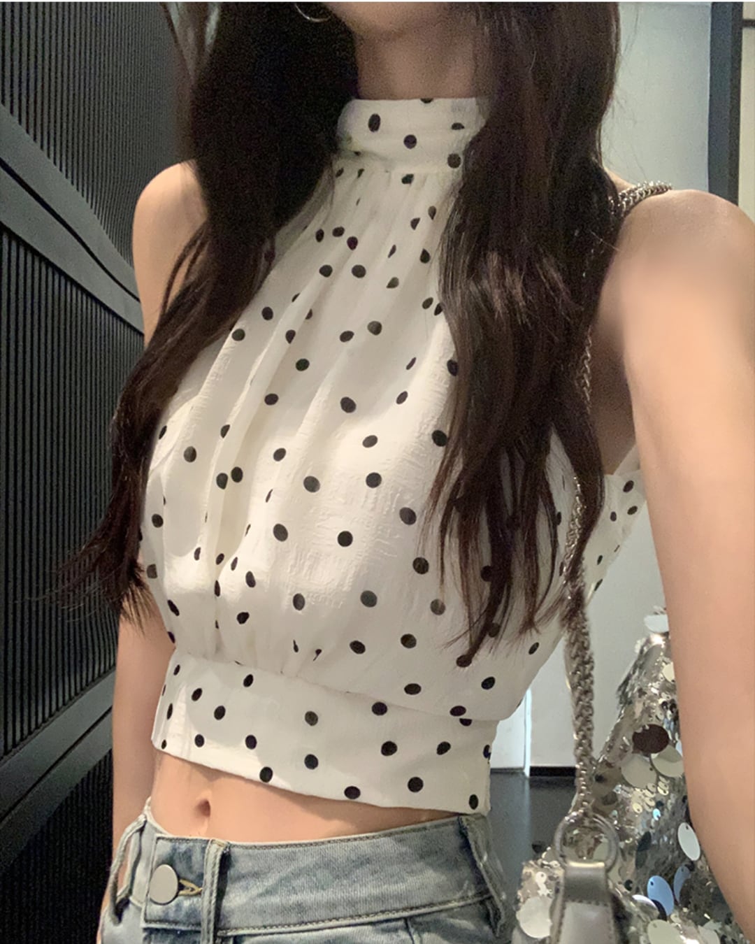 #ドット柄 #ホルターネック #リボントップス #ノースリーブ #大人フェミニン