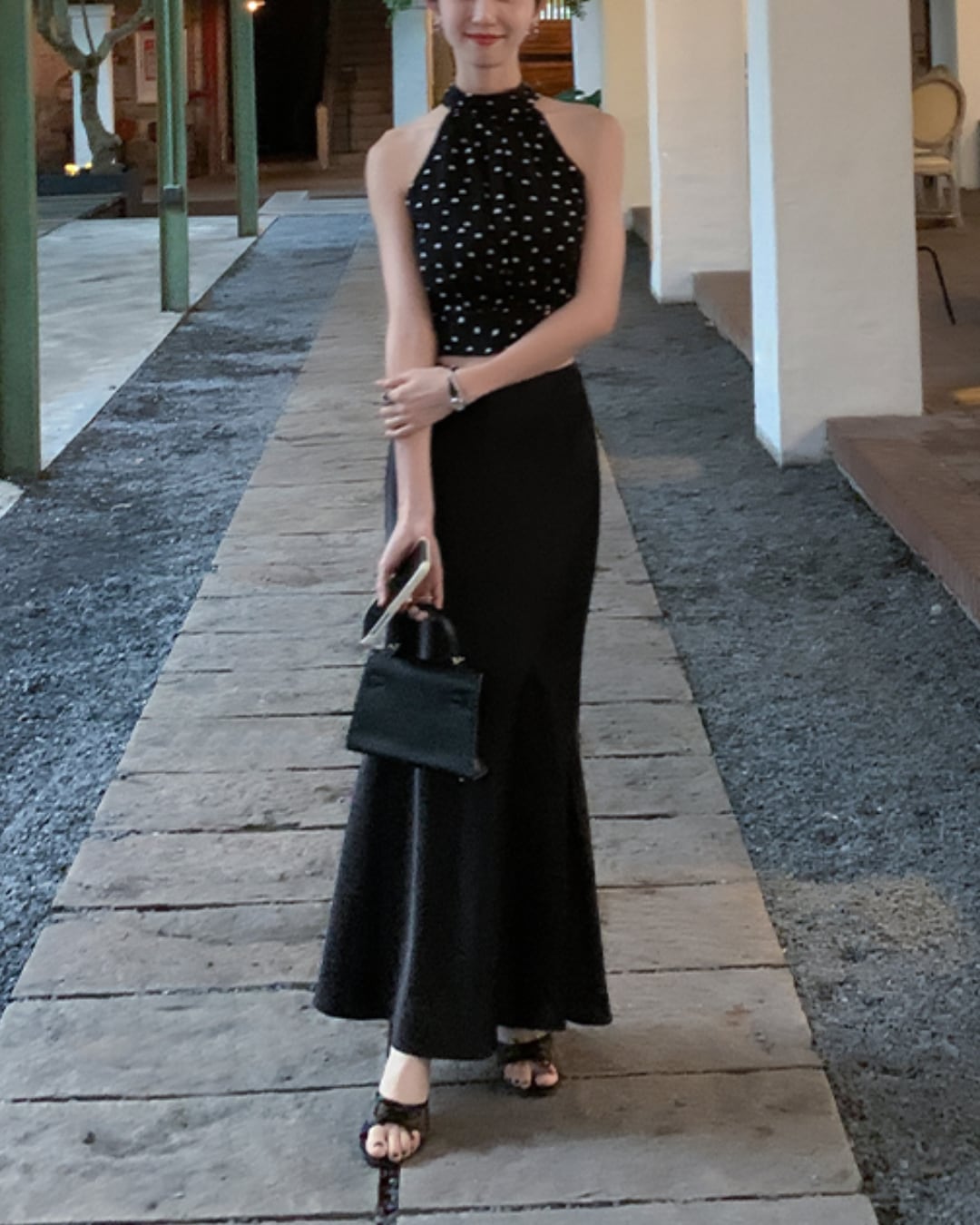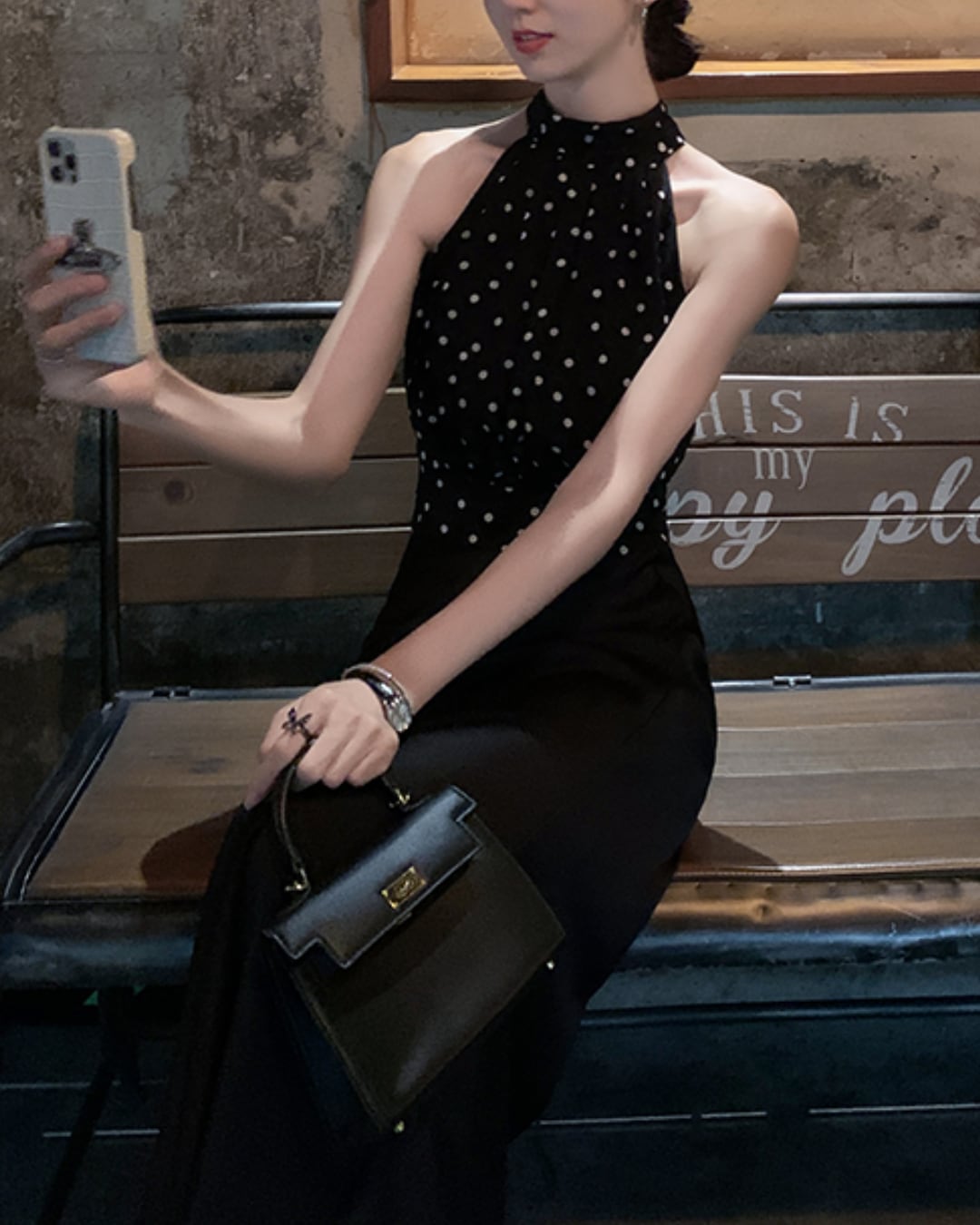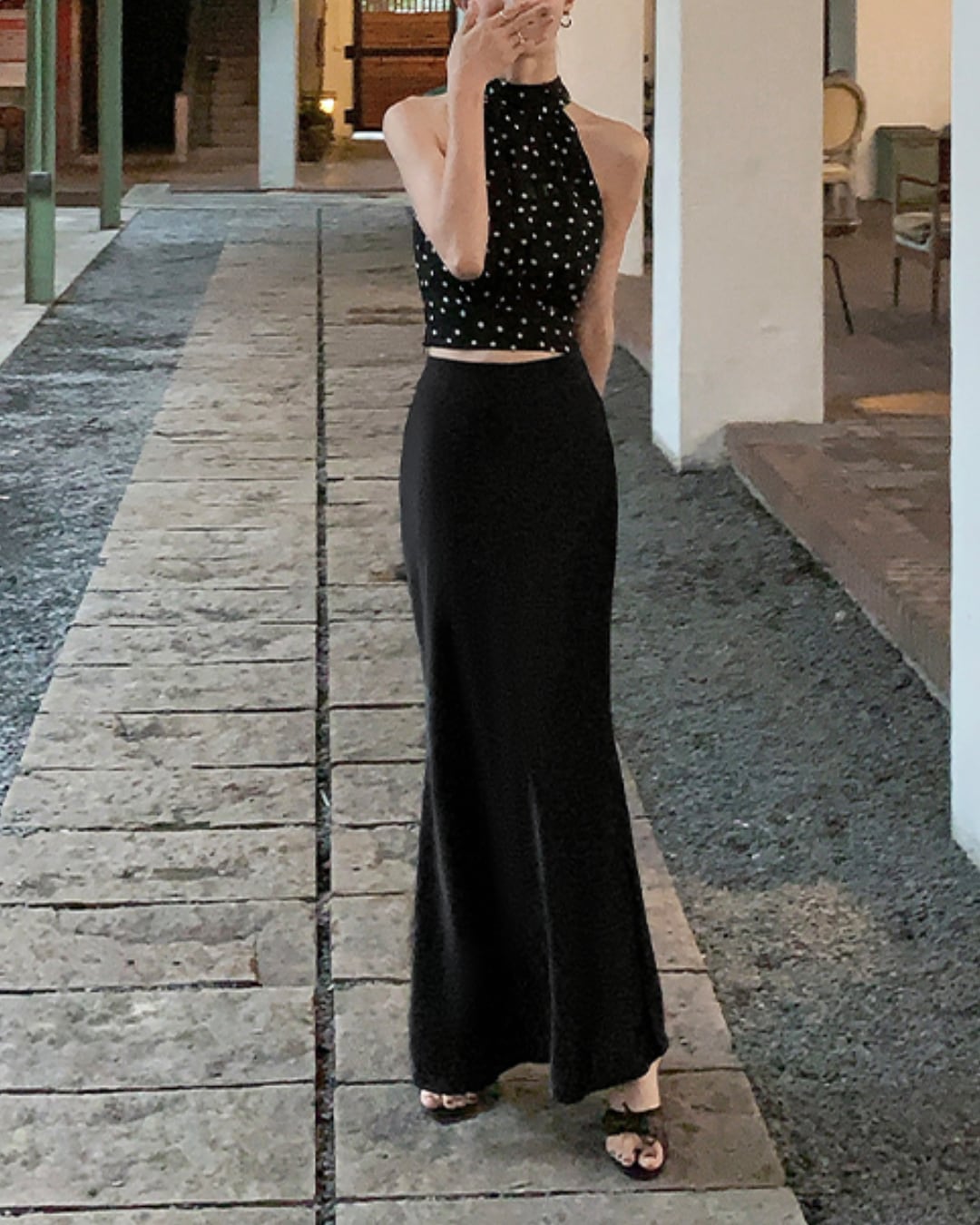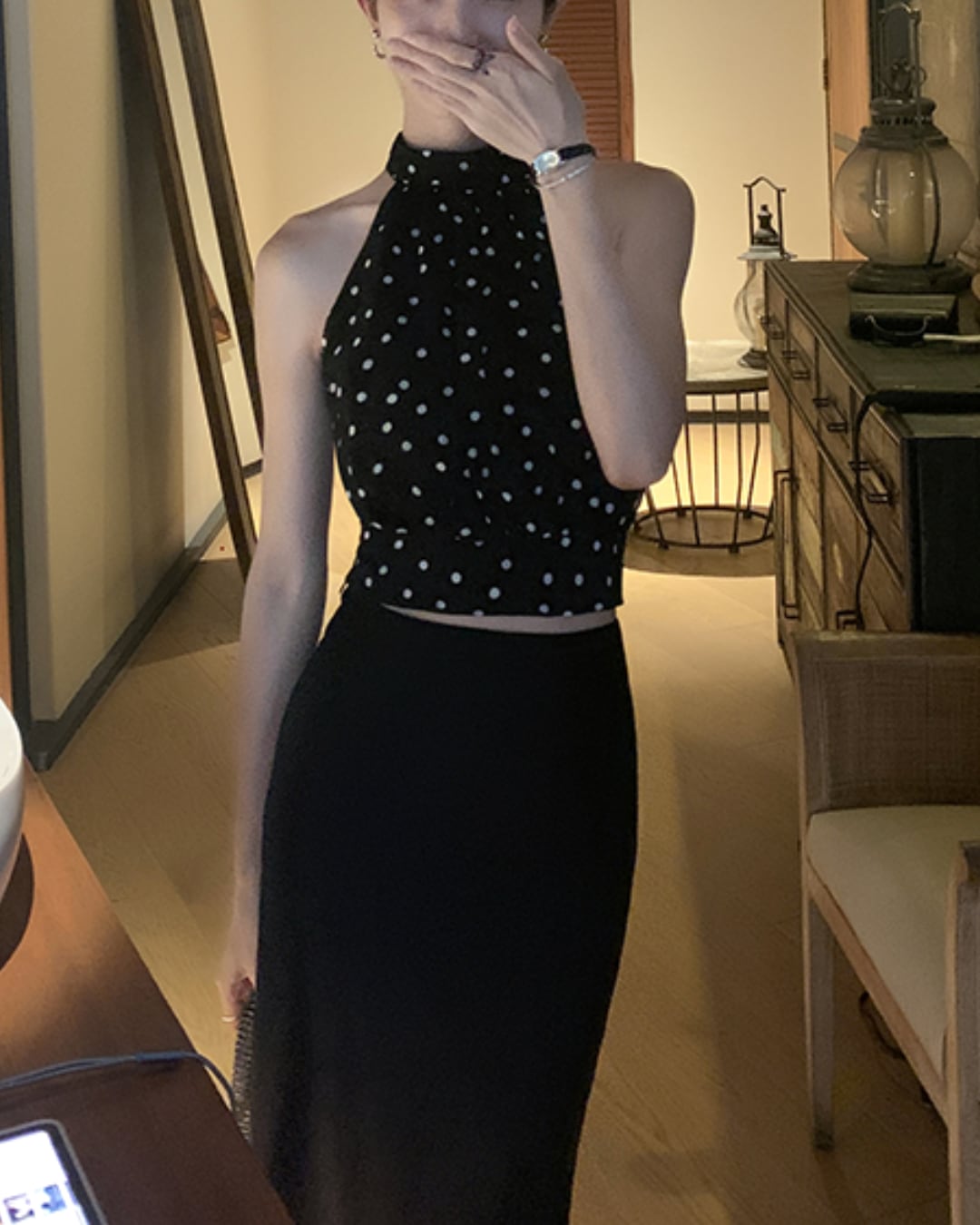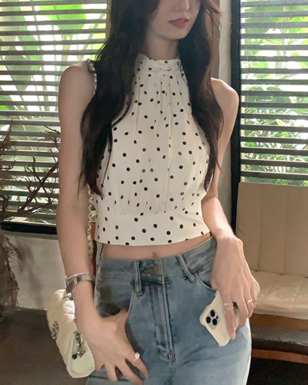 #ドット柄 #ホルターネック #リボントップス #ノースリーブ #大人フェミニン