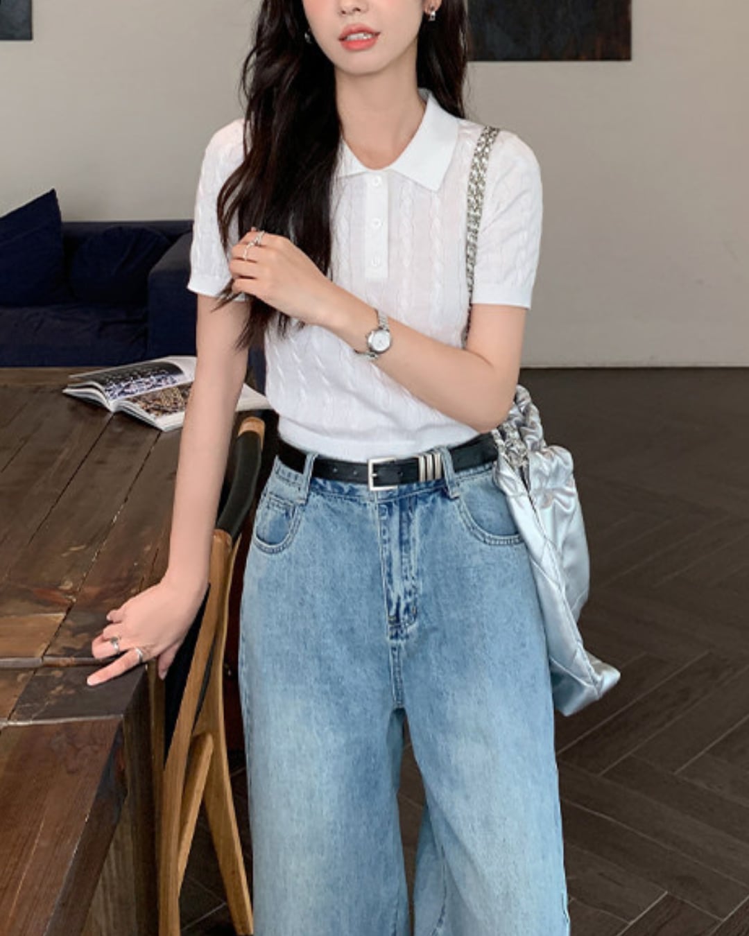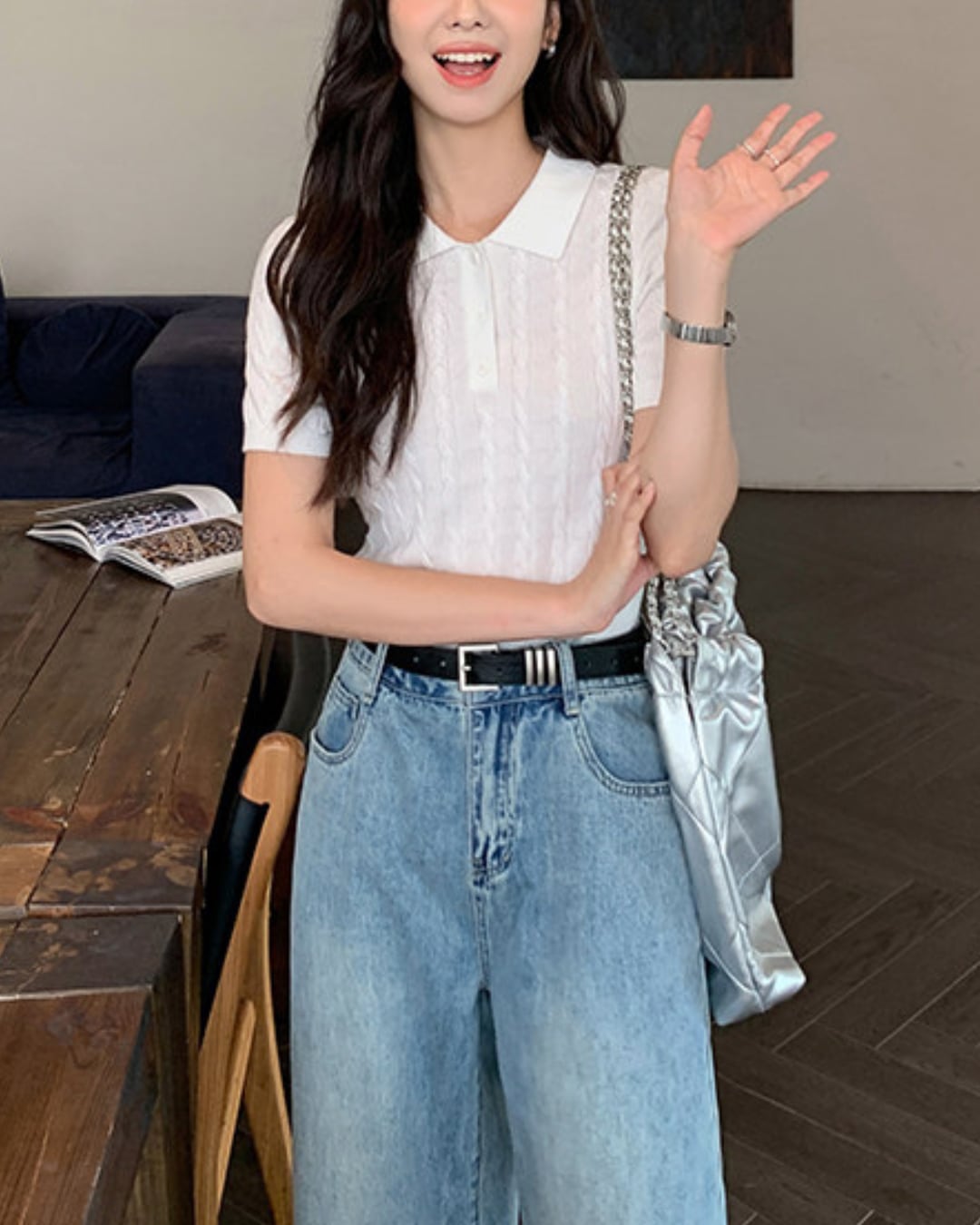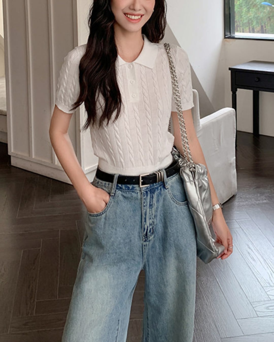 #ケーブルニット #半袖ニット #ポロニット #きれいめカジュアル #シンプルコーデ