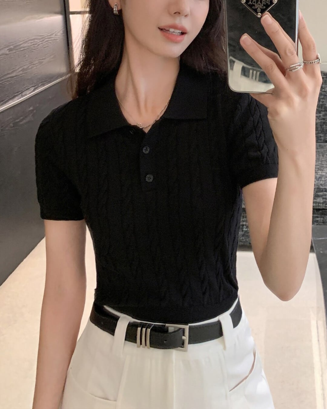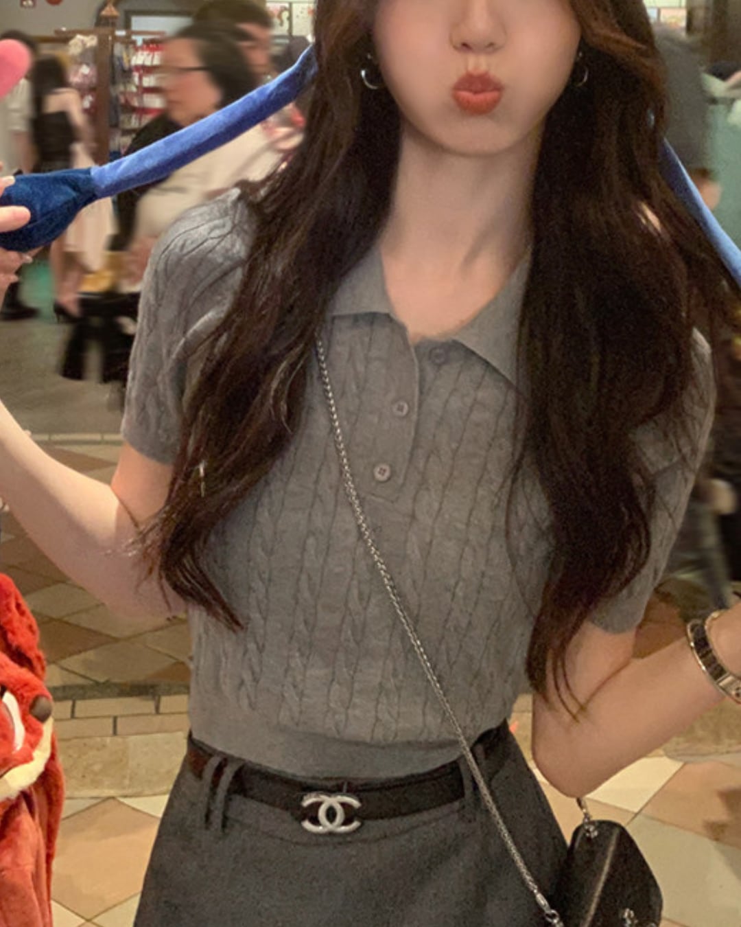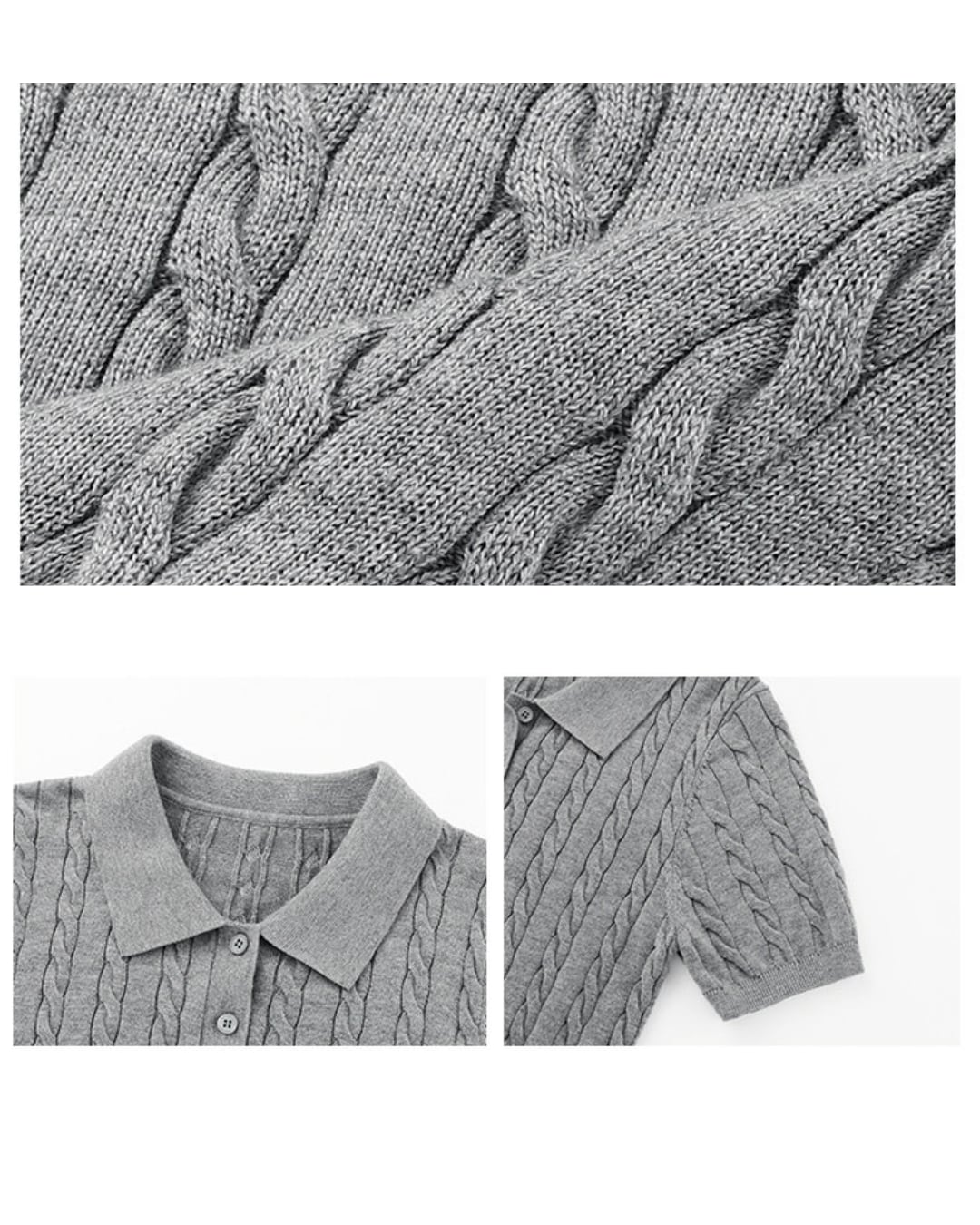 立体感のあるケーブル編みが特徴の半袖ニットトップス。ポロカラー仕様で、きちんと感とカジュアルさを兼ね備えたデザインです。コンパクトな丈感と程よいフィット感で、ボトムスを選ばずバランスよく着用可能。柔らかく肌なじみの良い素材感で、デイリー使いにもおすすめです。