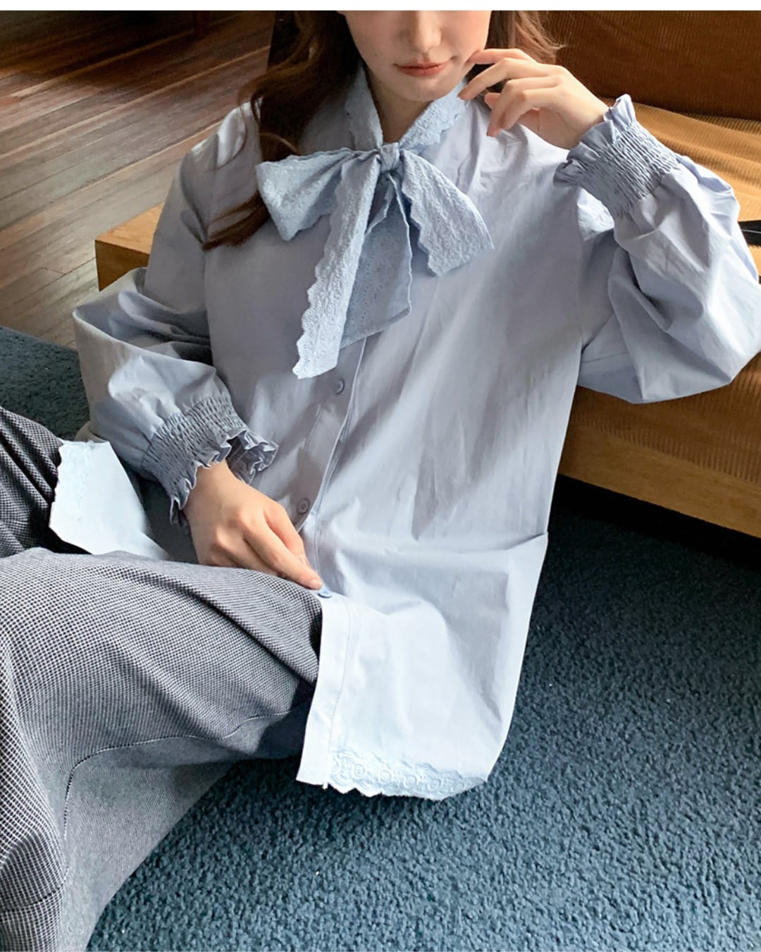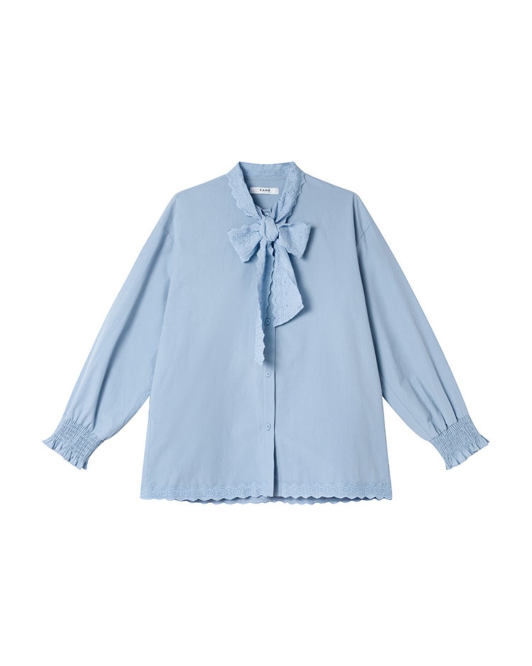 首元のレースリボンがポイントのコットンブラウス。全体はゆったりとしたシルエットで、体のラインを拾いにくく、リラックスした着用感です。袖口はシャーリング仕様で、やさしいボリューム感をプラス。裾と前立てには繊細なレースディテールを施し、シンプルながらも程よい甘さのあるデザインに仕上げています。前開きボタン仕様で、着脱しやすいのも特徴です。