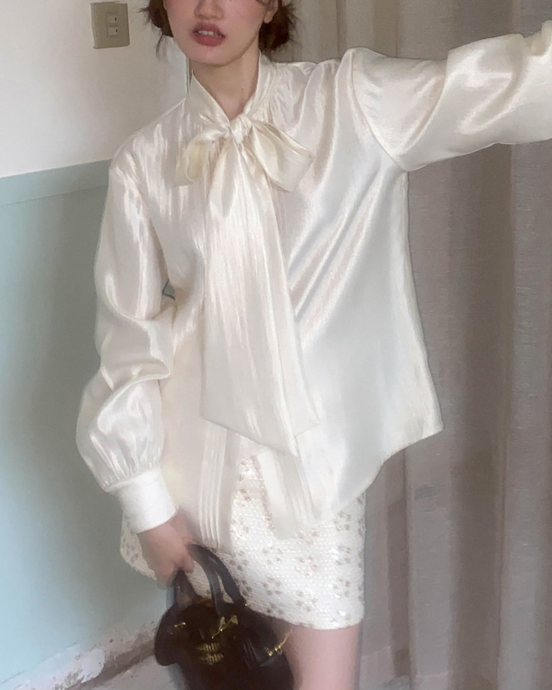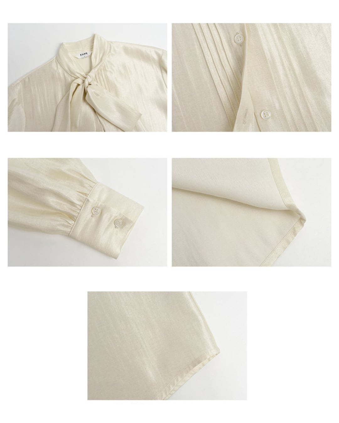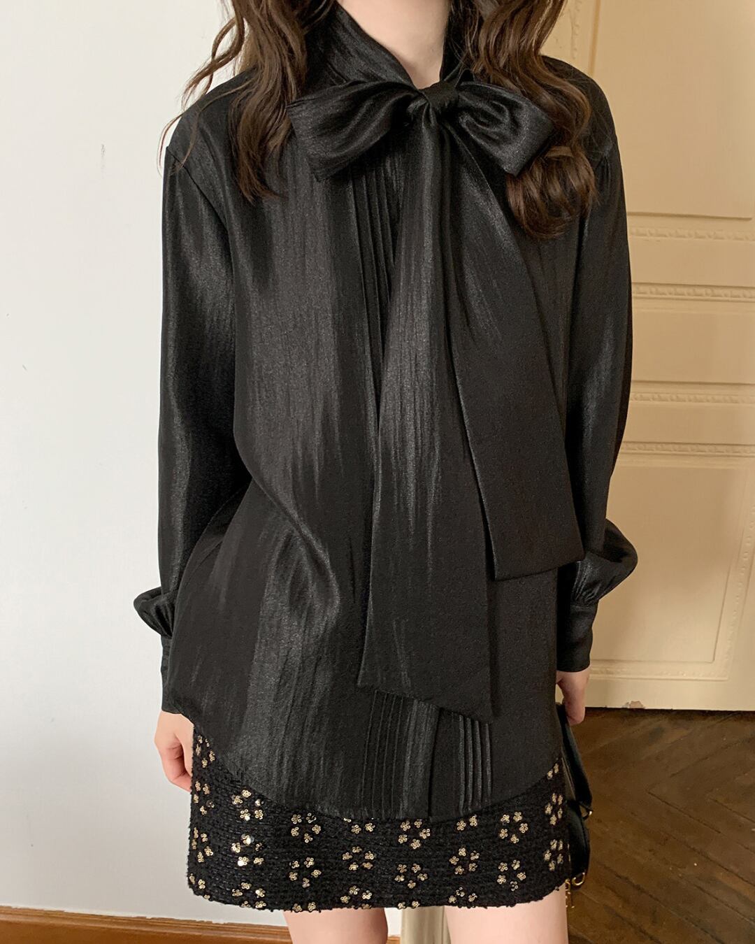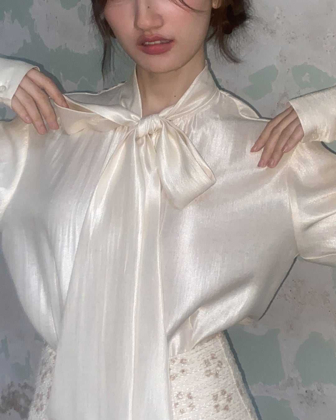 光沢感のある生地が特徴の、リボンタイ付き長袖ブラウス。首元の大きめリボンが華やかな印象を与え、スタイリングの主役になる一枚です。程よくゆとりのあるシルエットで、体のラインを拾いにくく、レイヤードもしやすいデザイン。フロントボタン仕様で着脱しやすく、スカートにもパンツにも合わせやすいアイテムです。