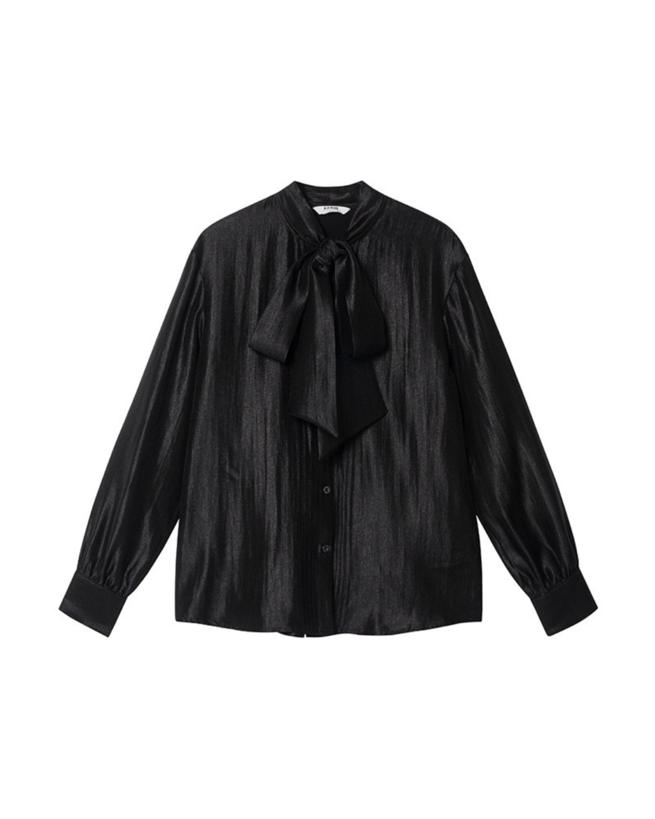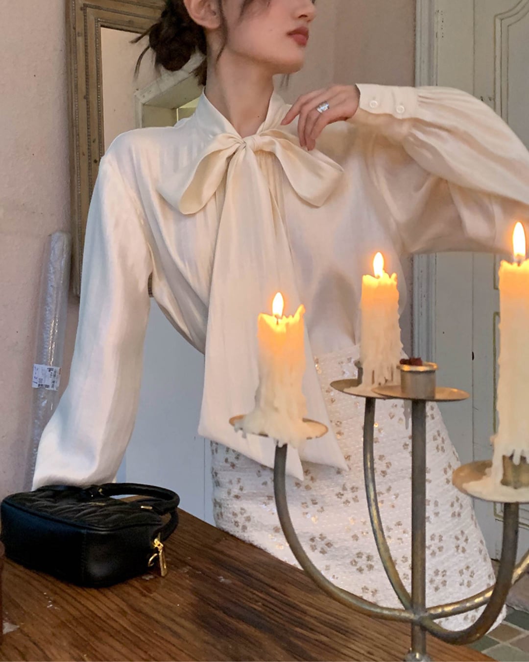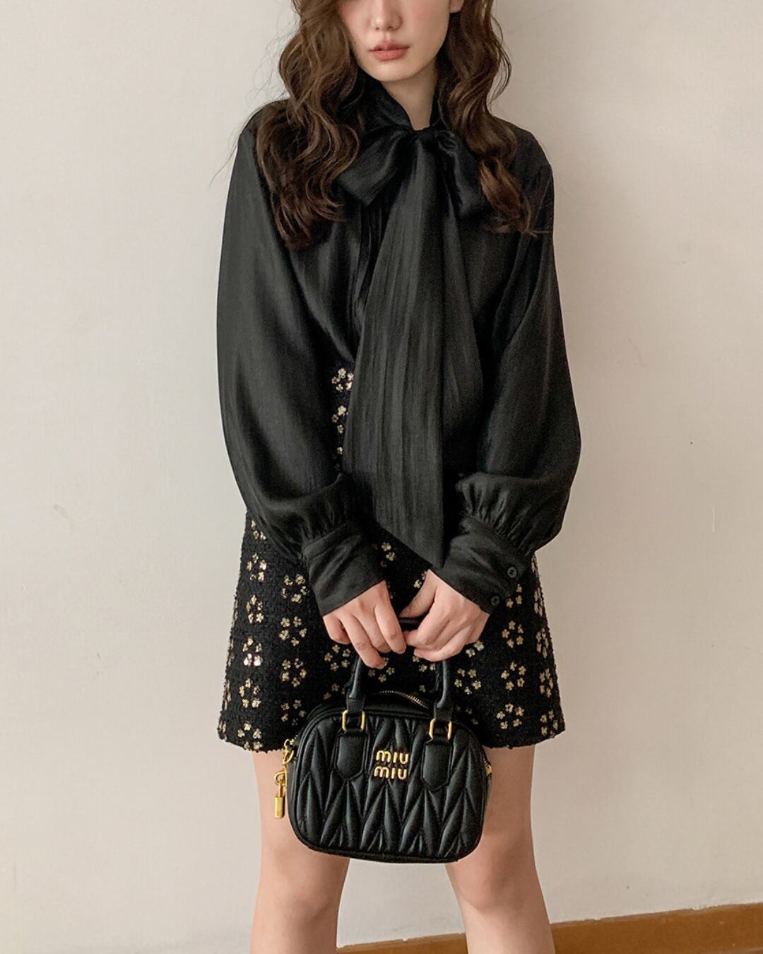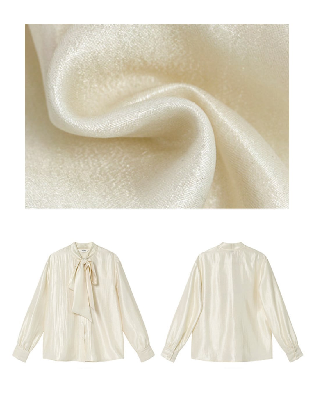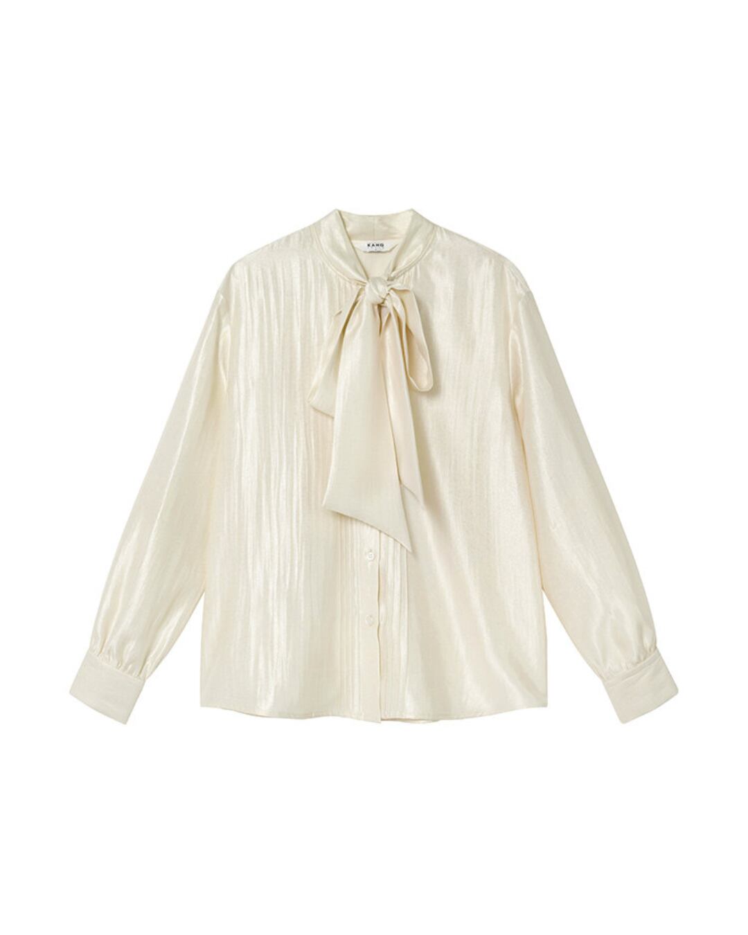 光沢感のある生地が特徴の、リボンタイ付き長袖ブラウス。首元の大きめリボンが華やかな印象を与え、スタイリングの主役になる一枚です。程よくゆとりのあるシルエットで、体のラインを拾いにくく、レイヤードもしやすいデザイン。フロントボタン仕様で着脱しやすく、スカートにもパンツにも合わせやすいアイテムです。