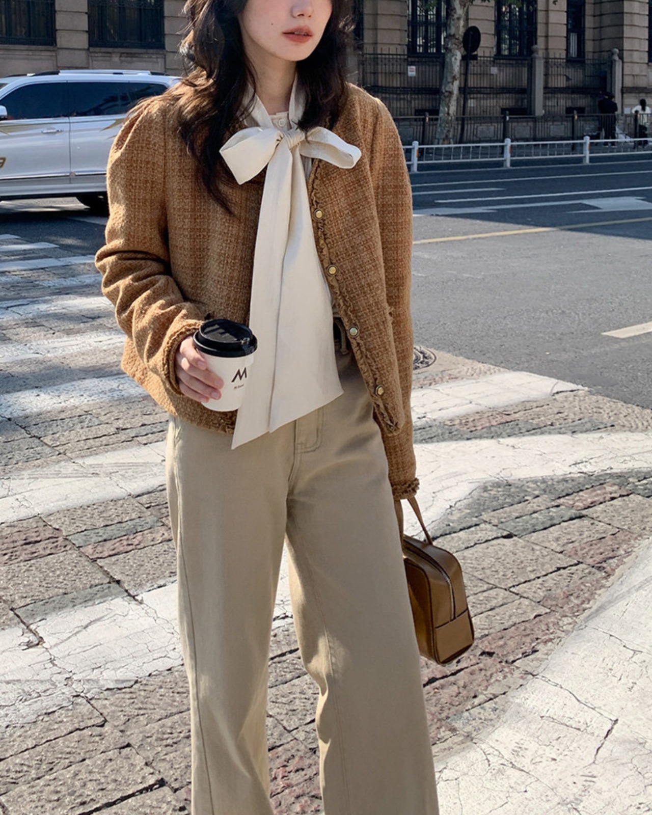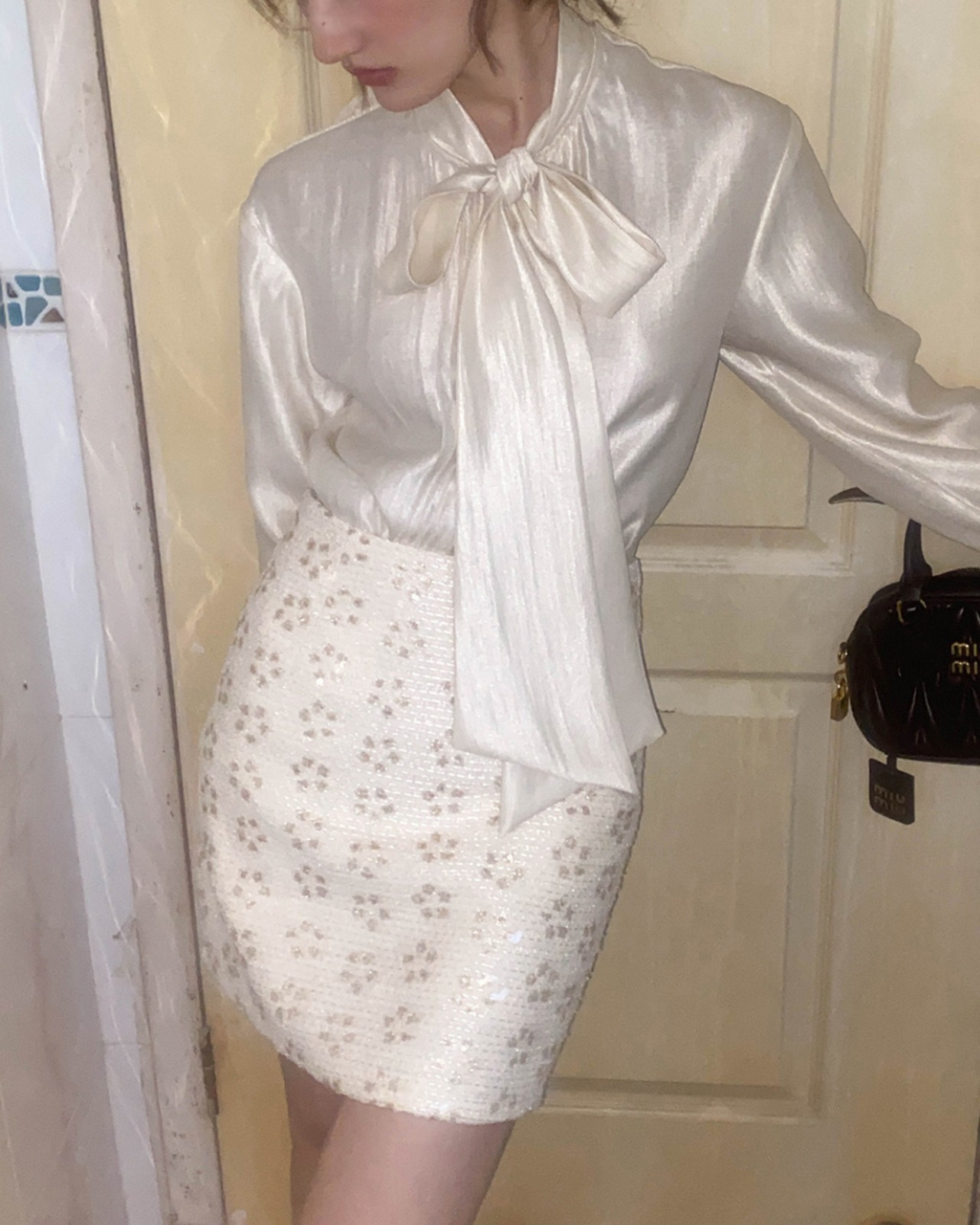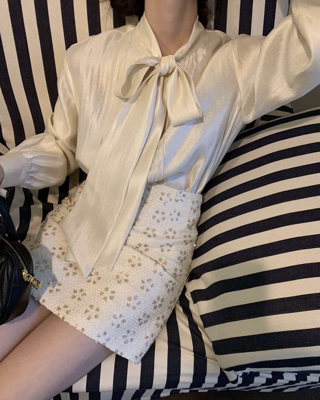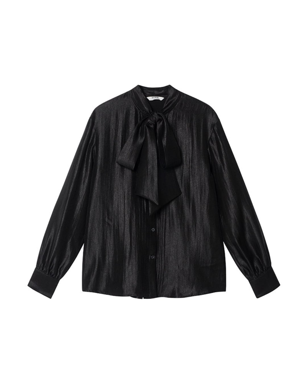 光沢感のある生地が特徴の、リボンタイ付き長袖ブラウス。首元の大きめリボンが華やかな印象を与え、スタイリングの主役になる一枚です。程よくゆとりのあるシルエットで、体のラインを拾いにくく、レイヤードもしやすいデザイン。フロントボタン仕様で着脱しやすく、スカートにもパンツにも合わせやすいアイテムです。