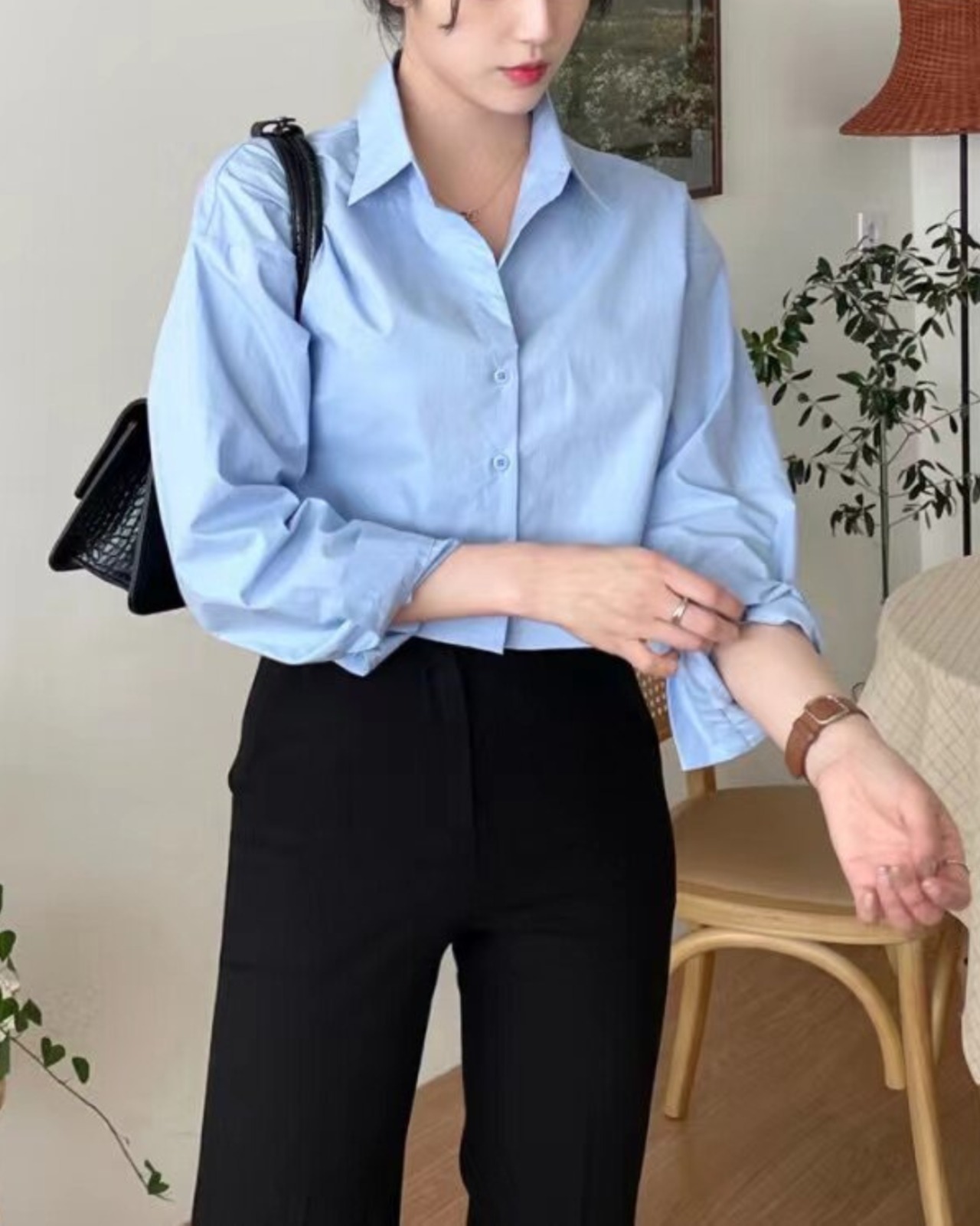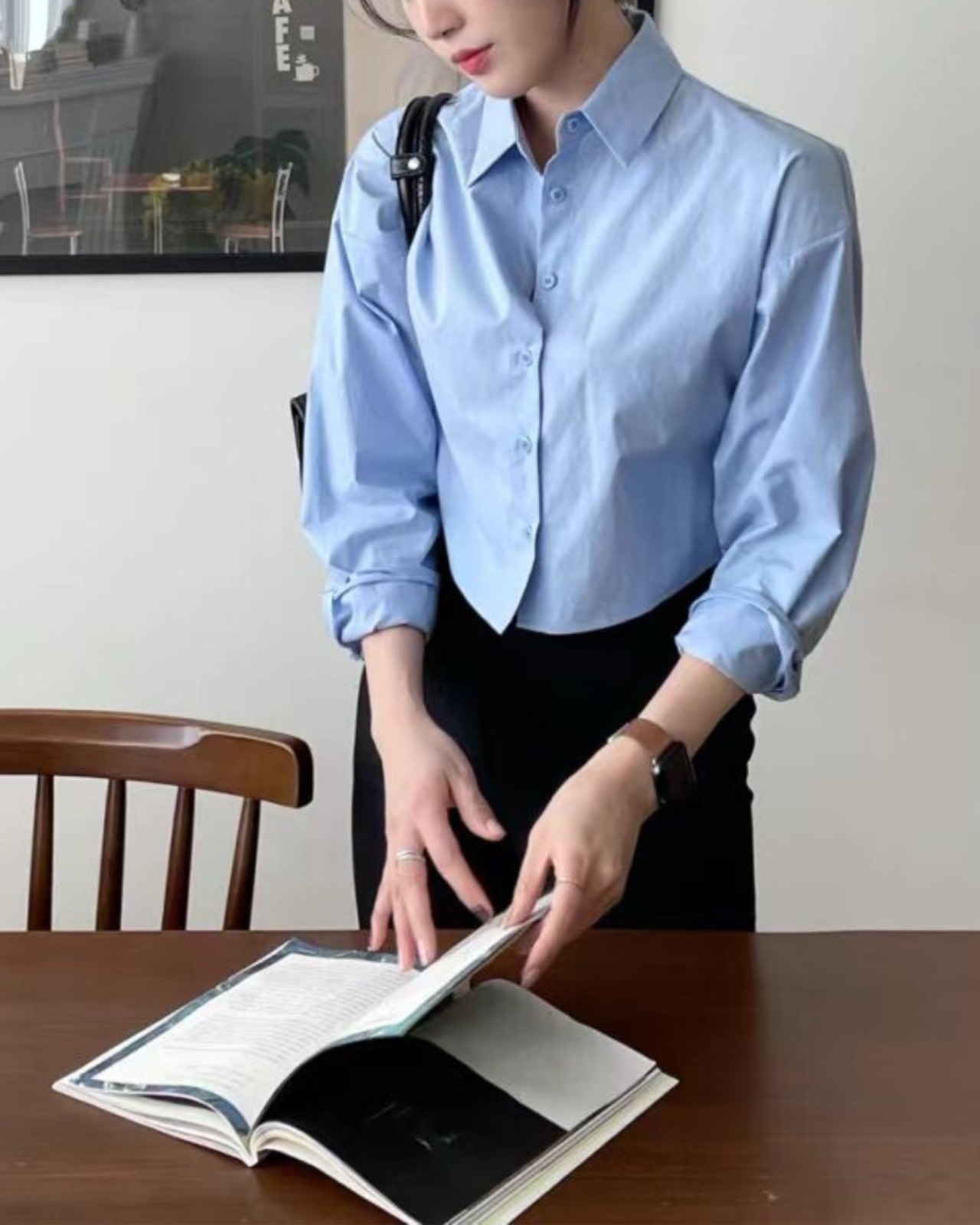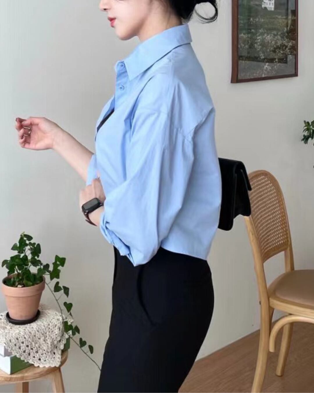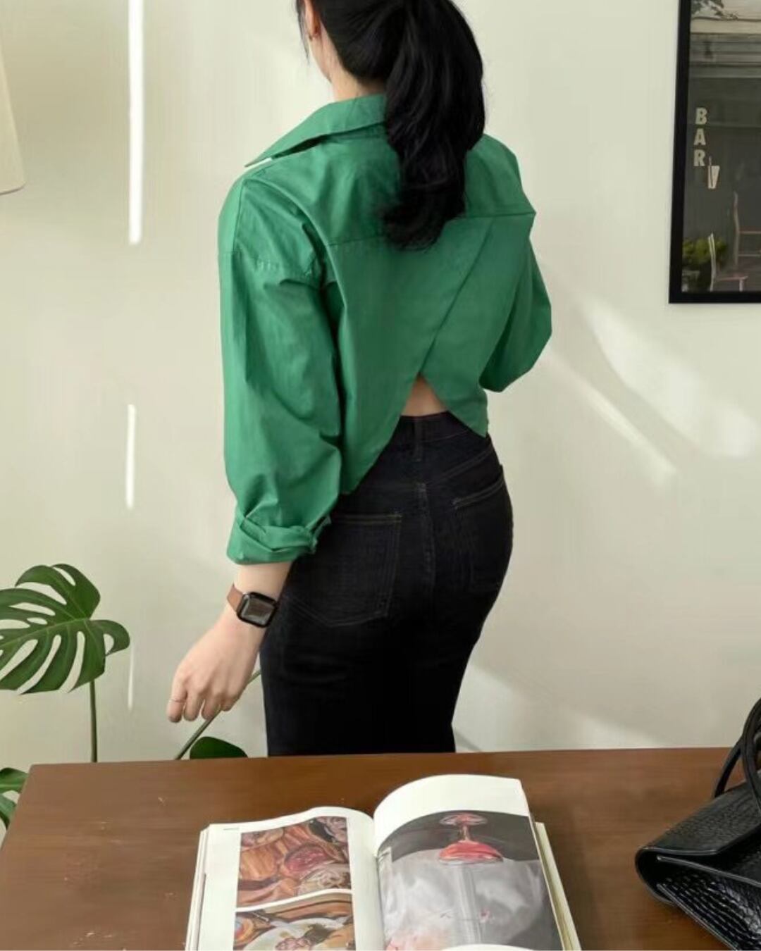 背中にクロスデザインを施した、印象的なバックスタイルのシャツトップス。フロントはベーシックなシャツデザインで、後ろ姿に程よい肌見せが生まれるバランスの取れた一枚です。コンパクトな丈感で、ハイウエストボトムやデニムとの相性も良く、スタイルアップ効果も◎。