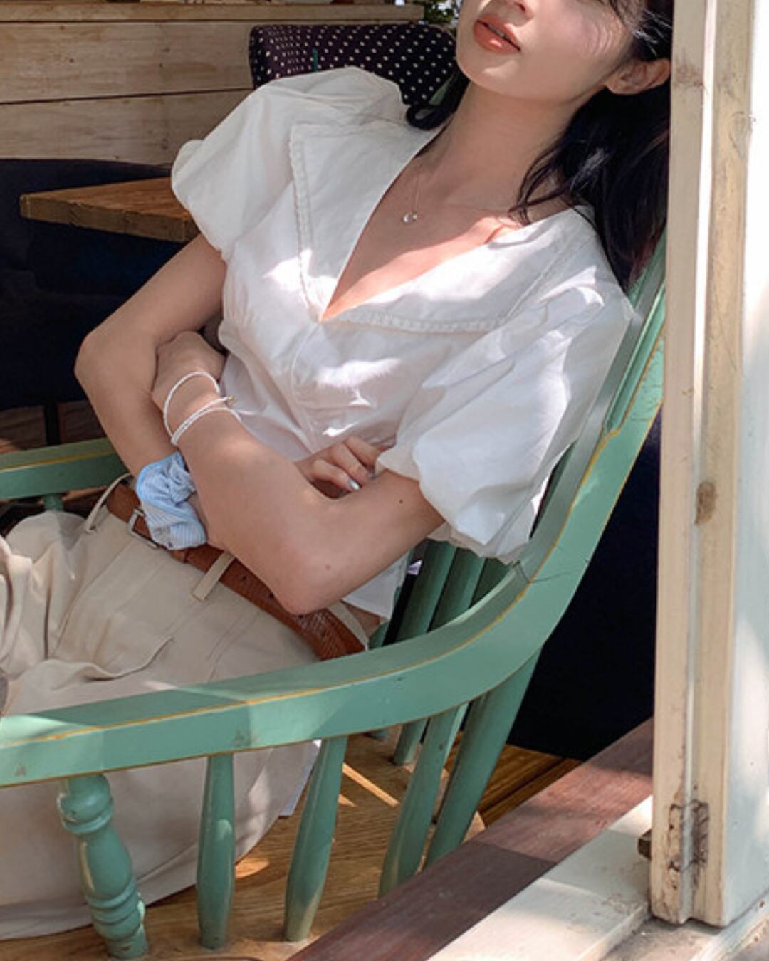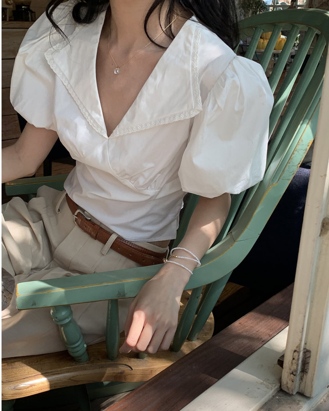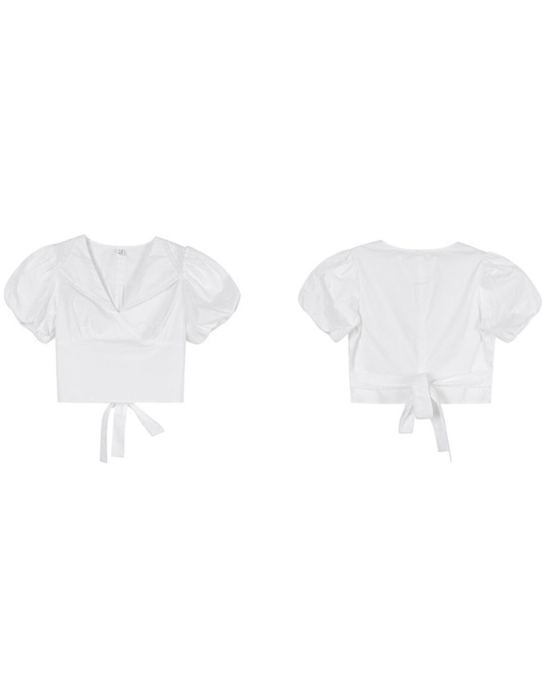 立体感のあるパフスリーブと、Vネックのセーラーカラーデザインが印象的なショート丈ブラウス。背中はリボン結び仕様で、後ろ姿まで抜かりないデザイン。コットン素材を使用し、程よい厚みでシーズン問わず着用しやすい一枚です。