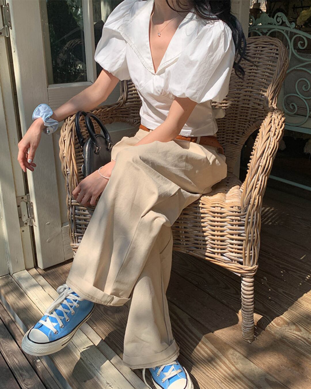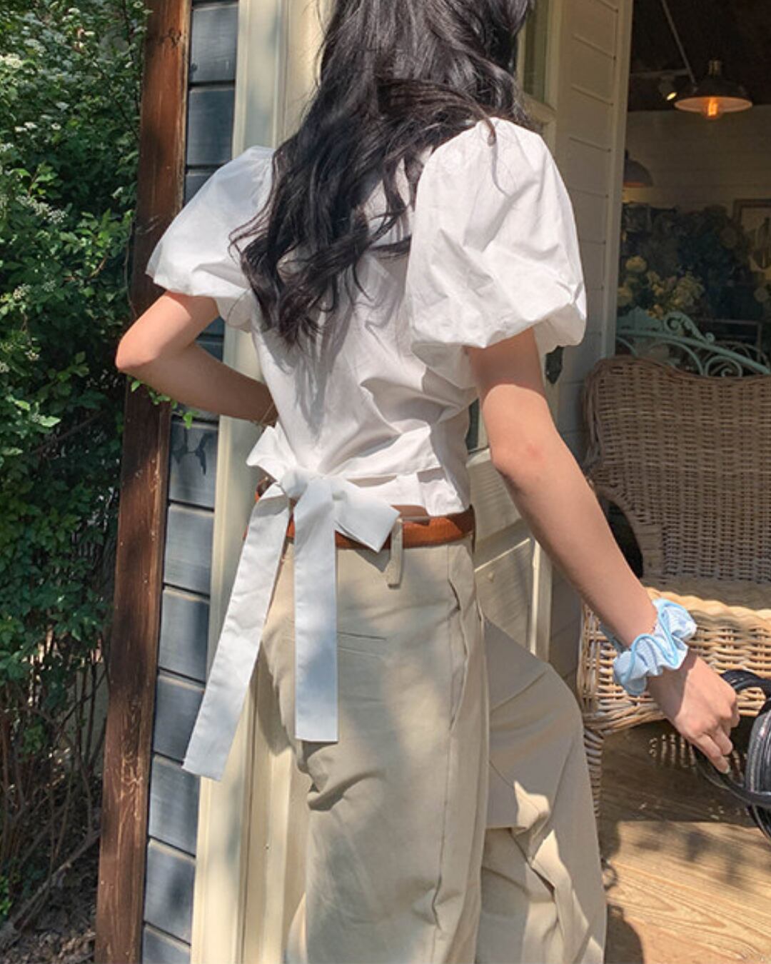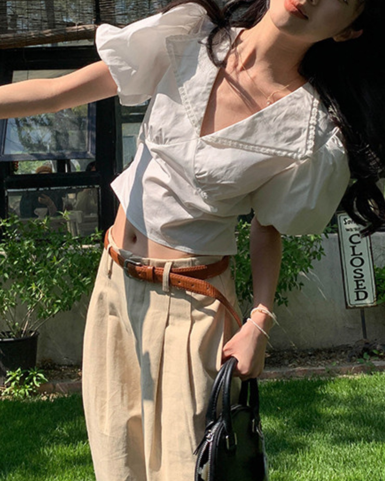 立体感のあるパフスリーブと、Vネックのセーラーカラーデザインが印象的なショート丈ブラウス。背中はリボン結び仕様で、後ろ姿まで抜かりないデザイン。コットン素材を使用し、程よい厚みでシーズン問わず着用しやすい一枚です。