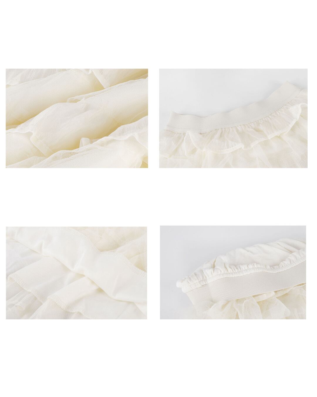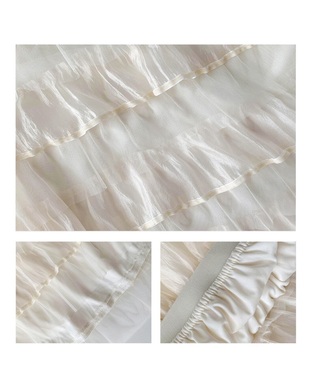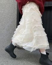 繊細なチュールをたっぷり重ねたティアードデザインのフリルスカート。歩くたびにふわっと揺れるボリューム感が魅力で、スウェットやTシャツを合わせて甘辛ミックスコーデもおすすめ。
