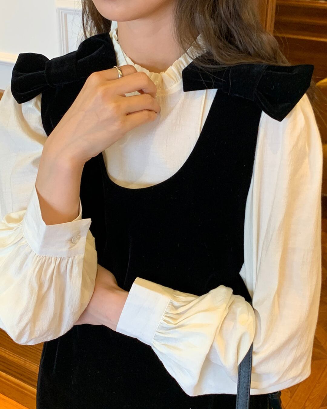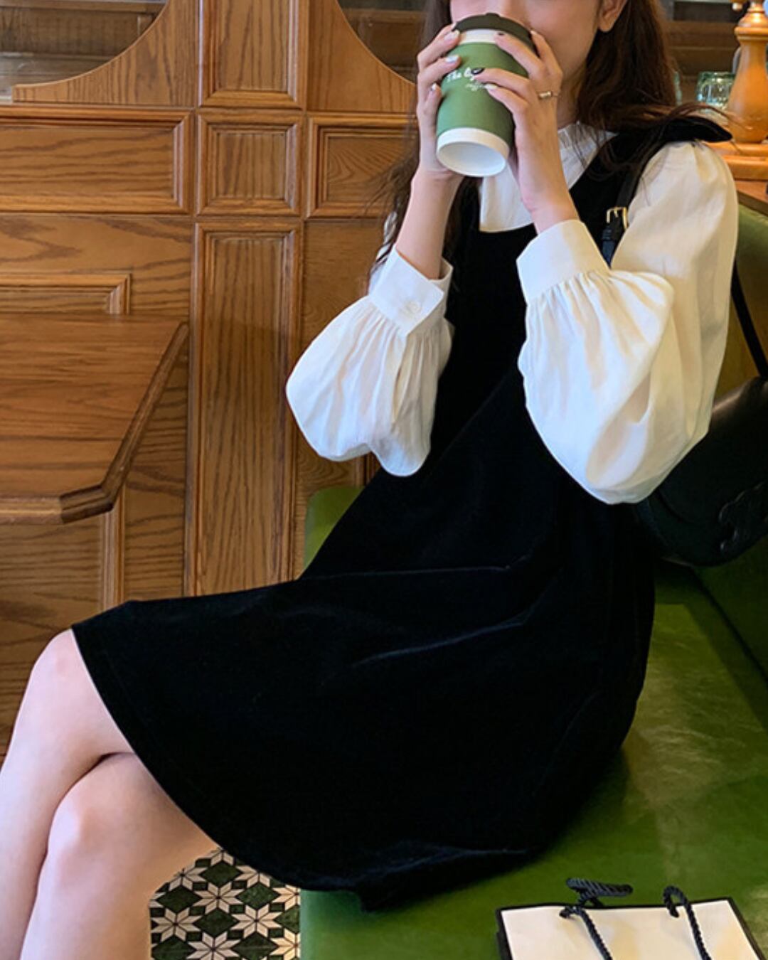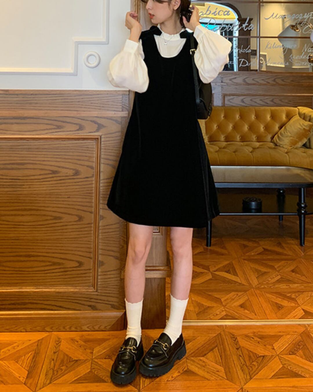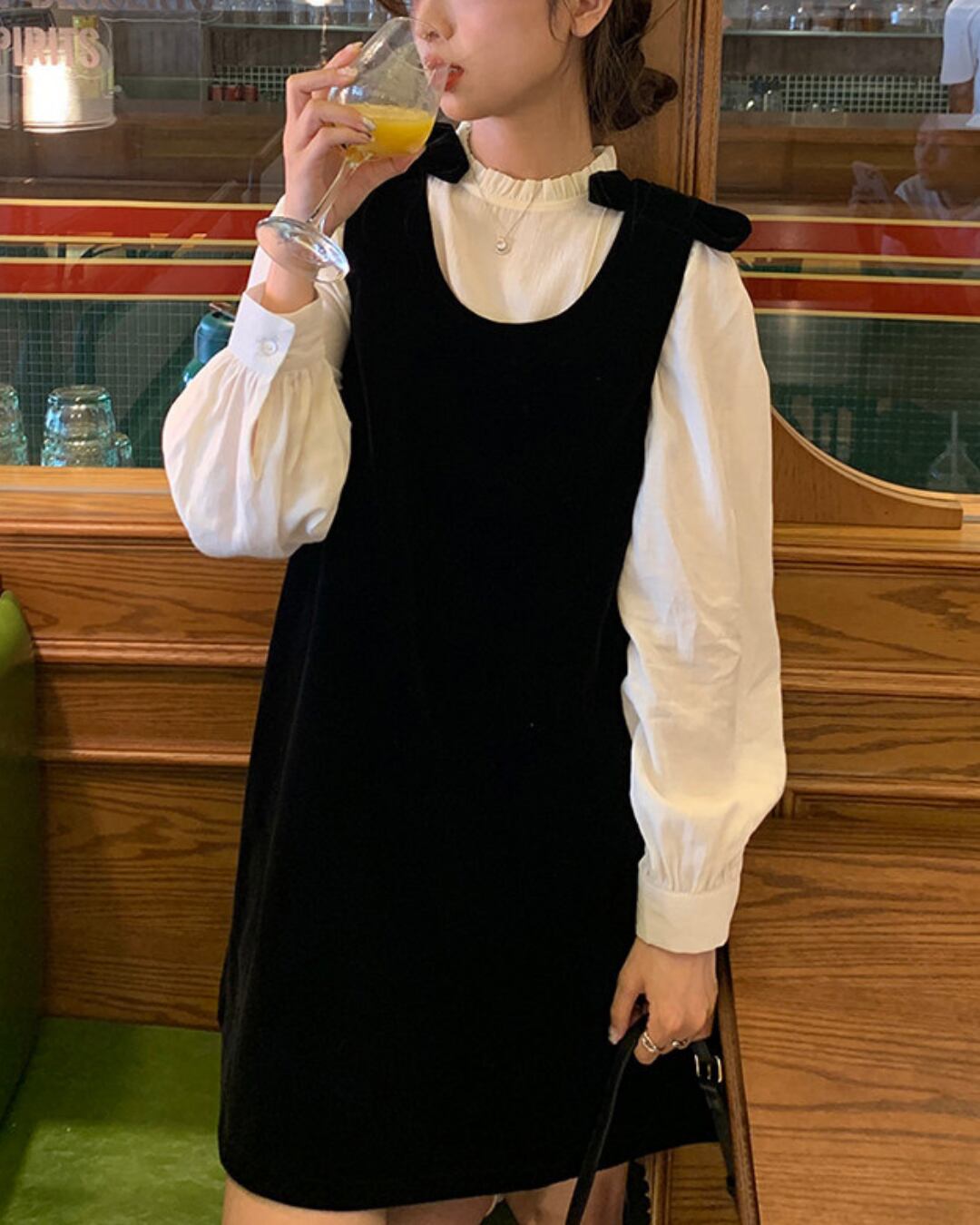 #ジャンパースカート #ベロアワンピース #リボンデザイン #クラシカルコーデ #レイヤードコーデ #大人ガーリー