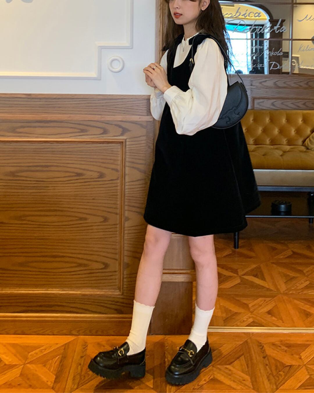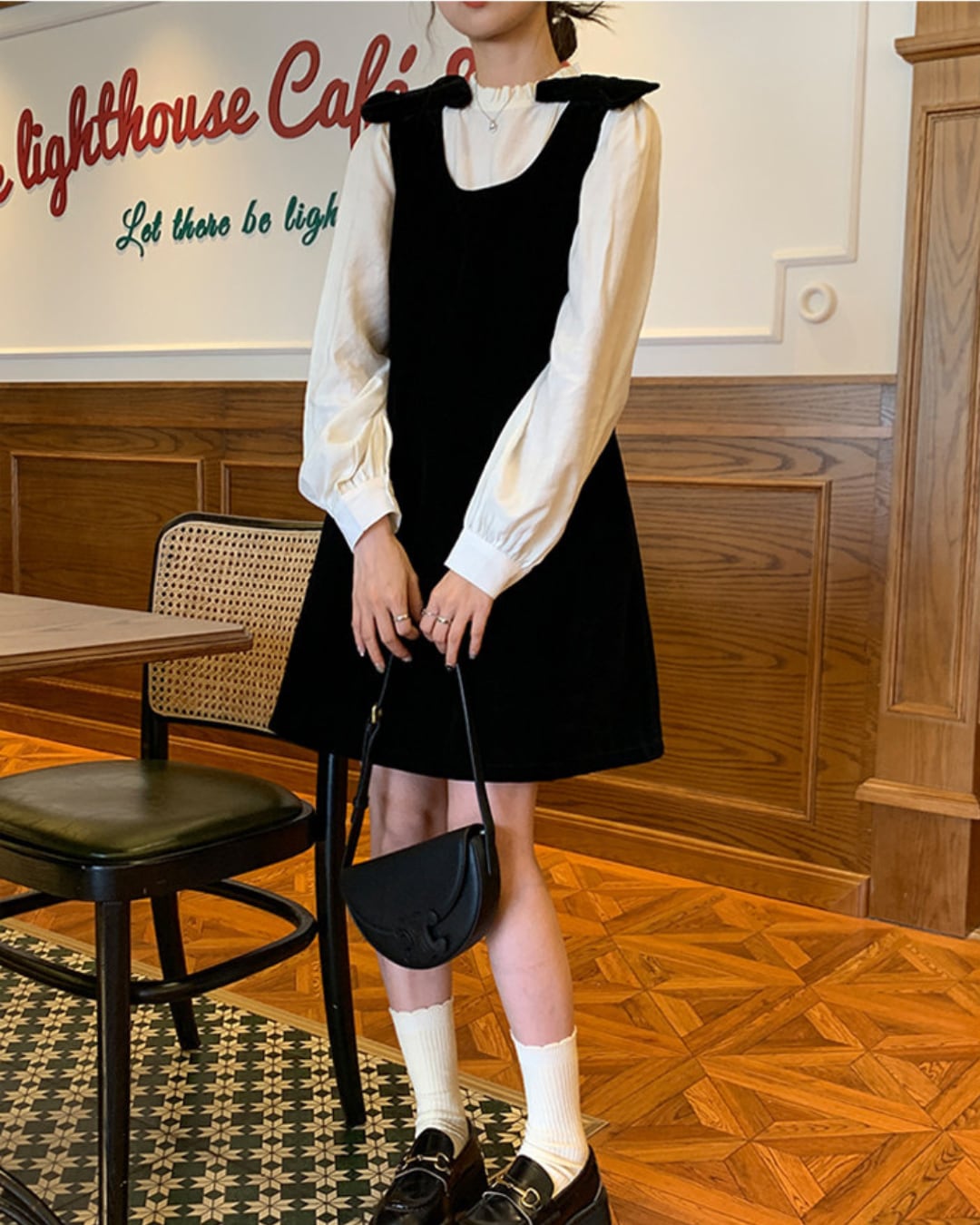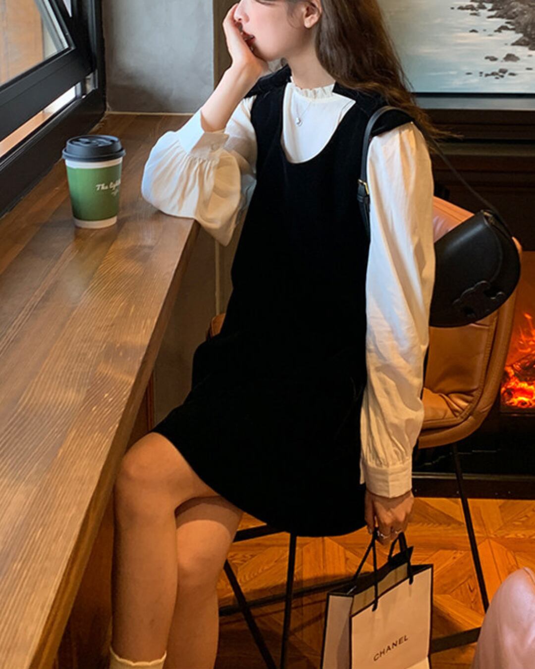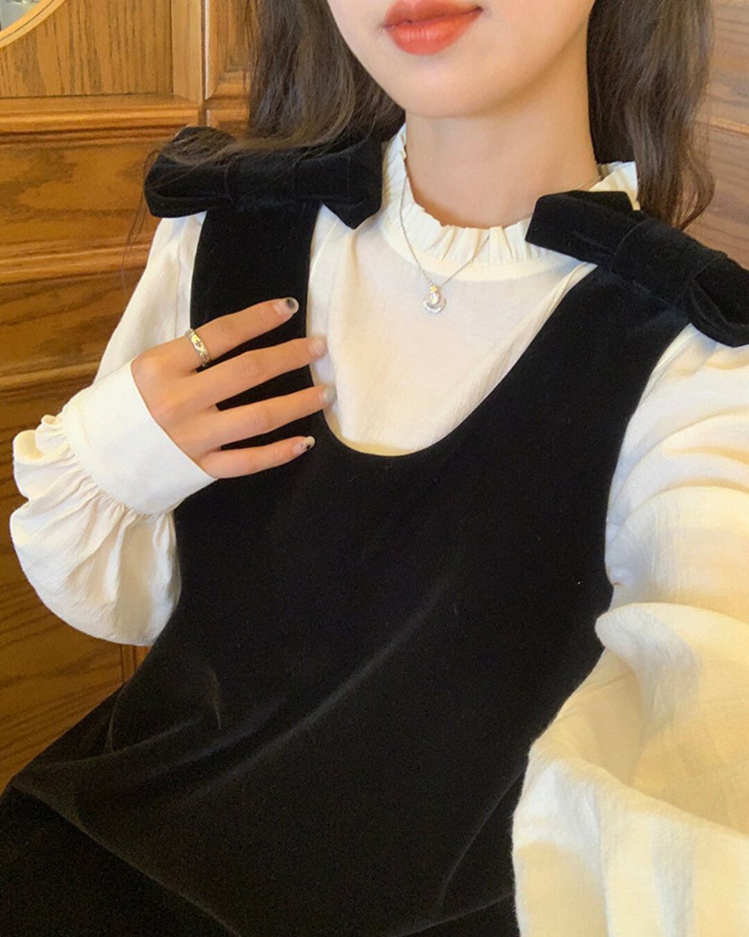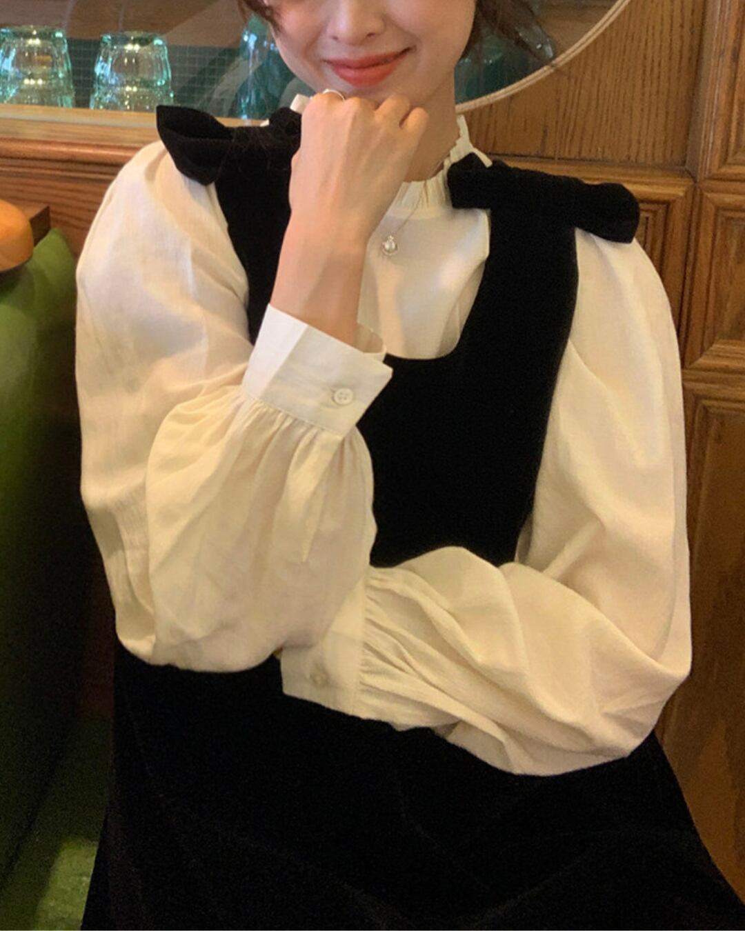 #ジャンパースカート #ベロアワンピース #リボンデザイン #クラシカルコーデ #レイヤードコーデ #大人ガーリー