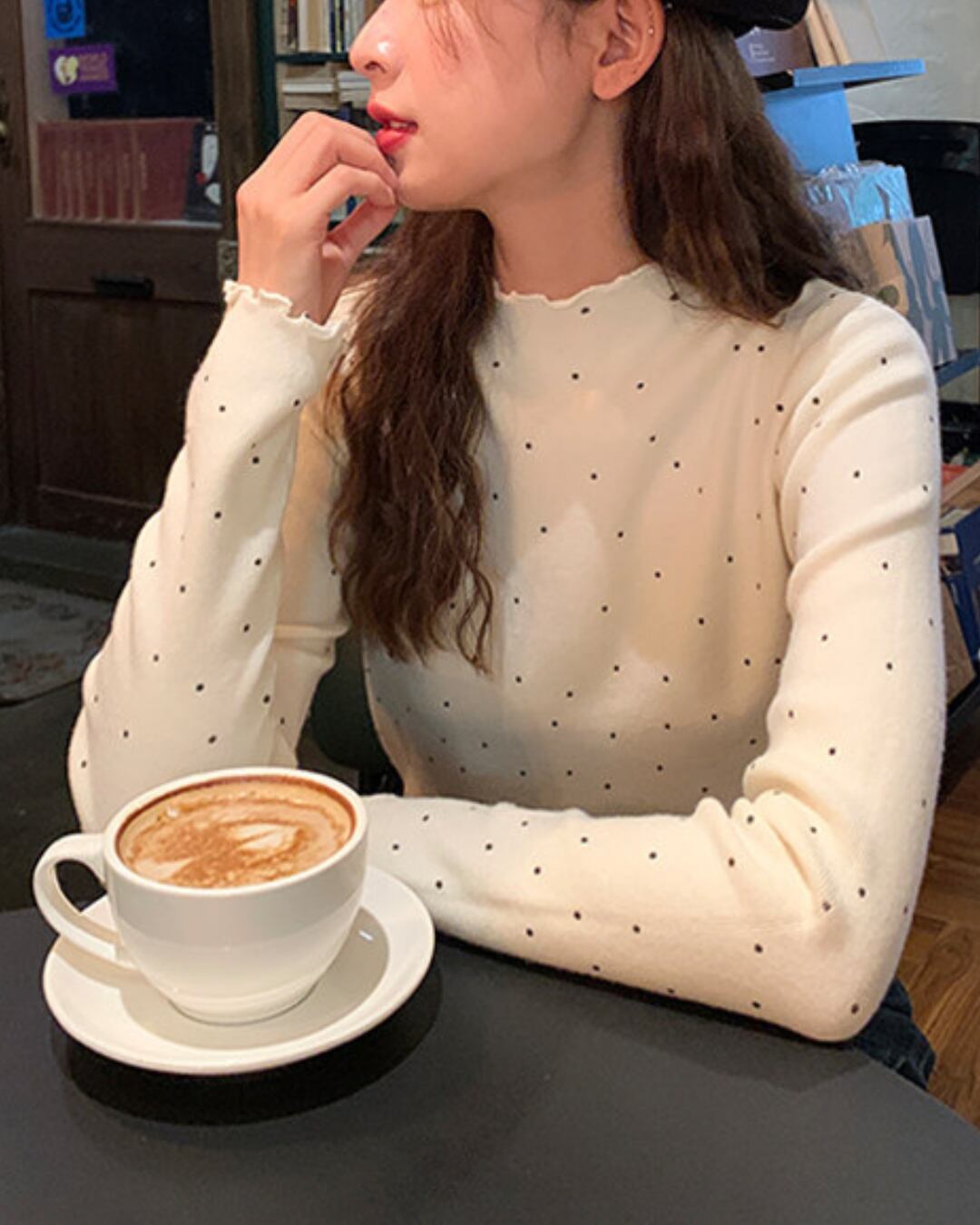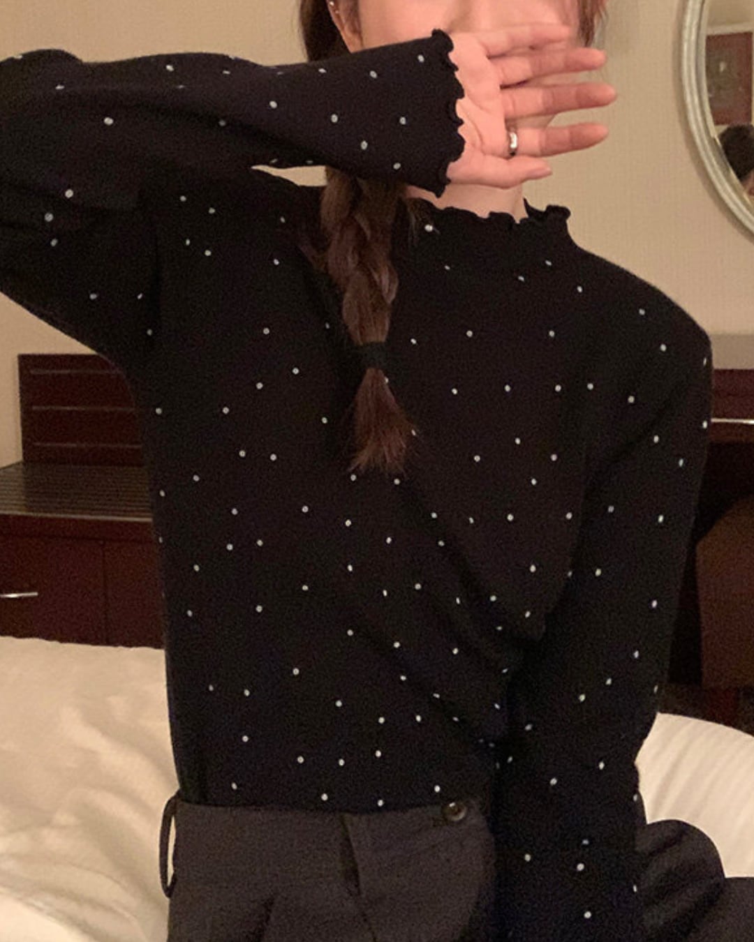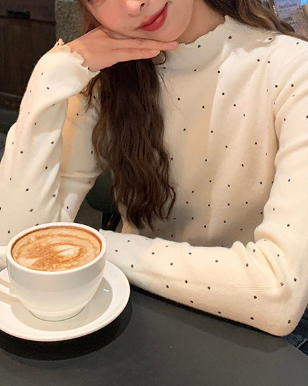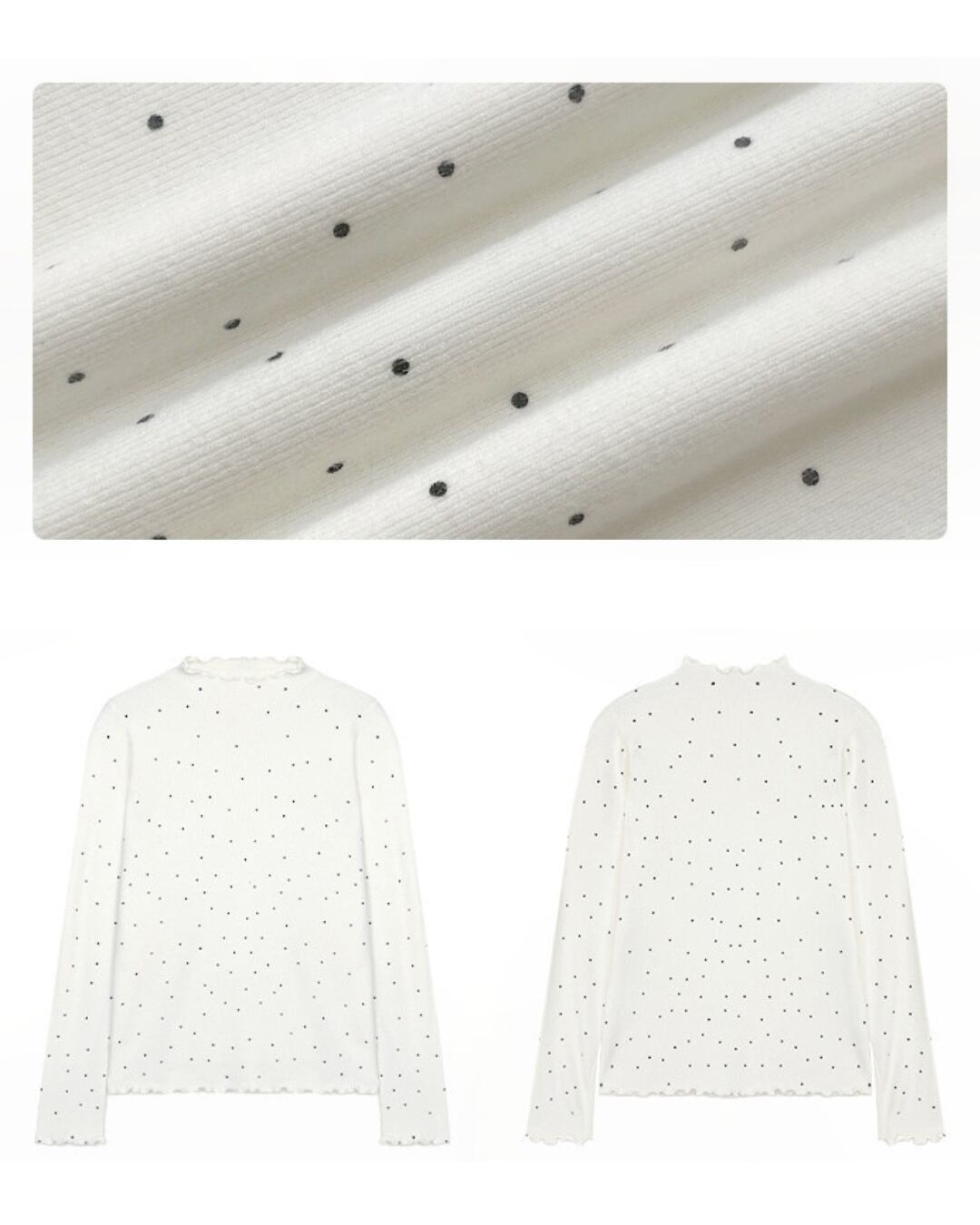 小さなドット柄が上品で大人可愛い印象を演出してくれるハイネックトップス。首元・袖口・裾にはさりげないメローフリルデザインを施し、シンプルながらも女性らしい柔らかさをプラス。程よくフィットするシルエットで、インナーとしても一枚着としても活躍します。きれいめパンツやスカートと合わせれば上品スタイルに、デニムと合わせればカジュアルダウンも楽しめる万能アイテムです。