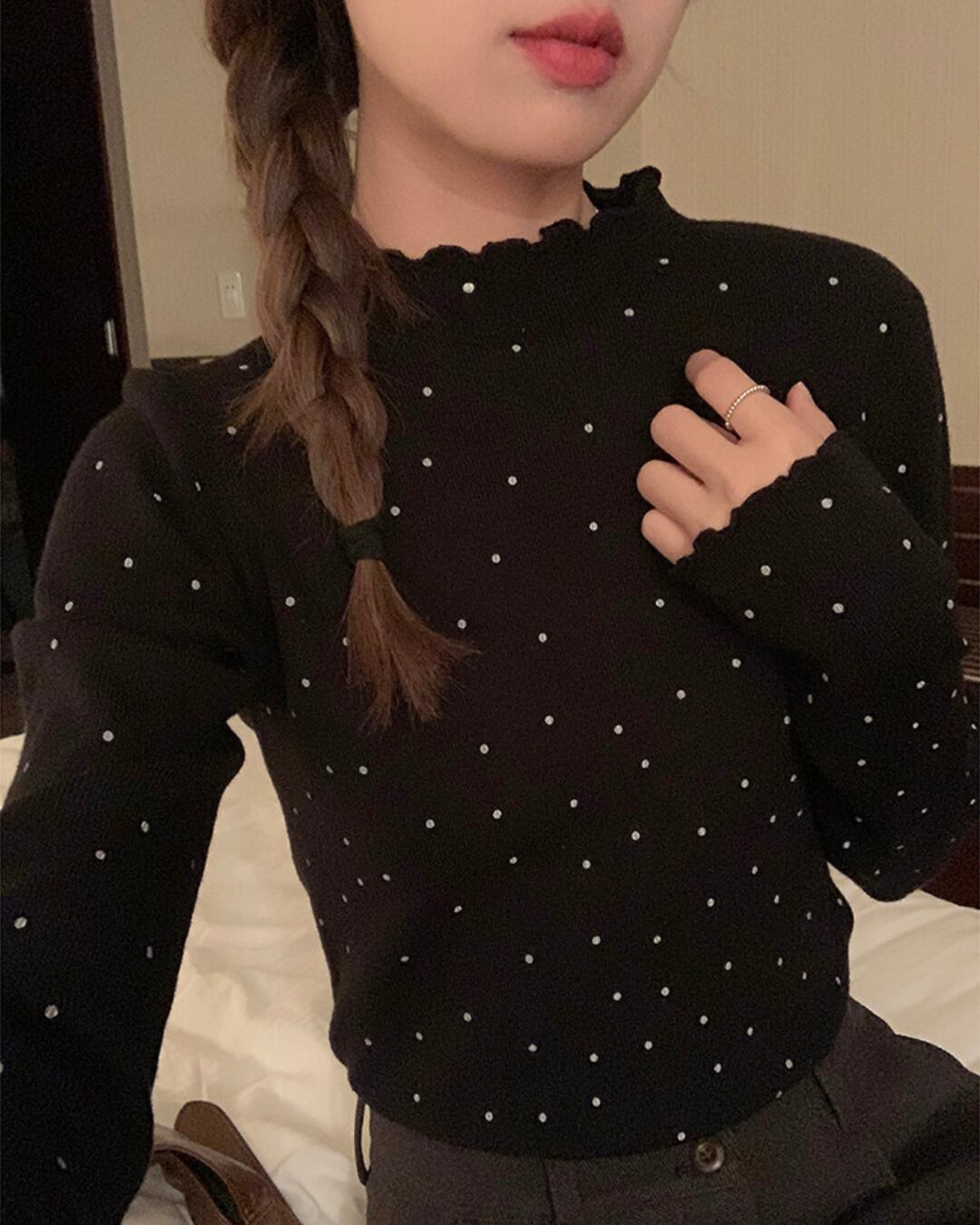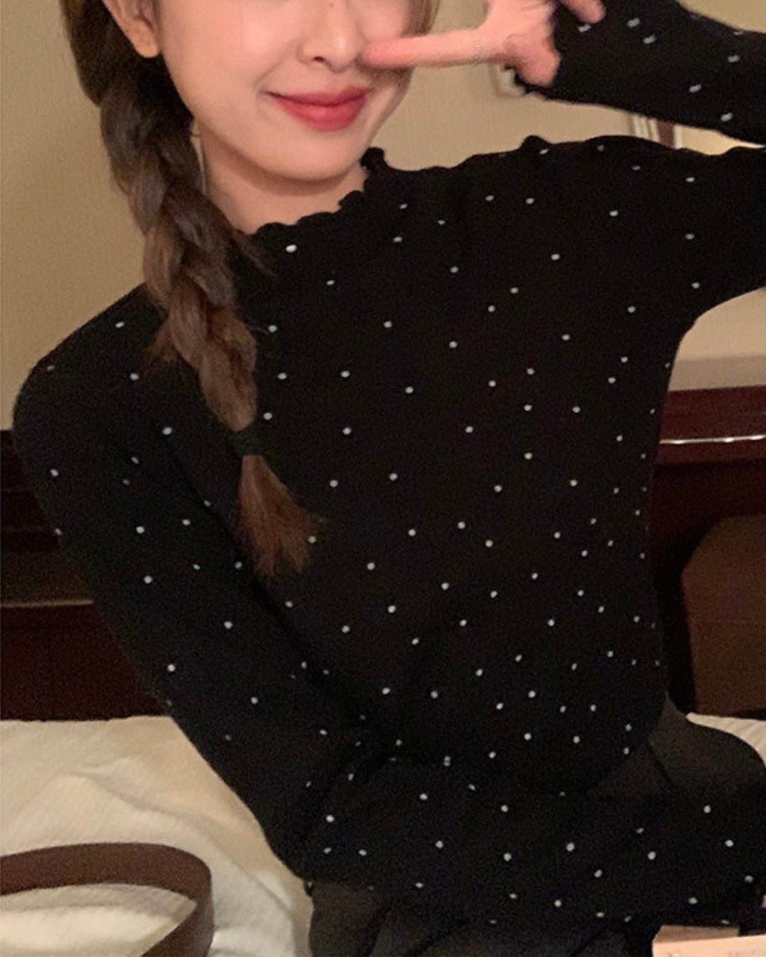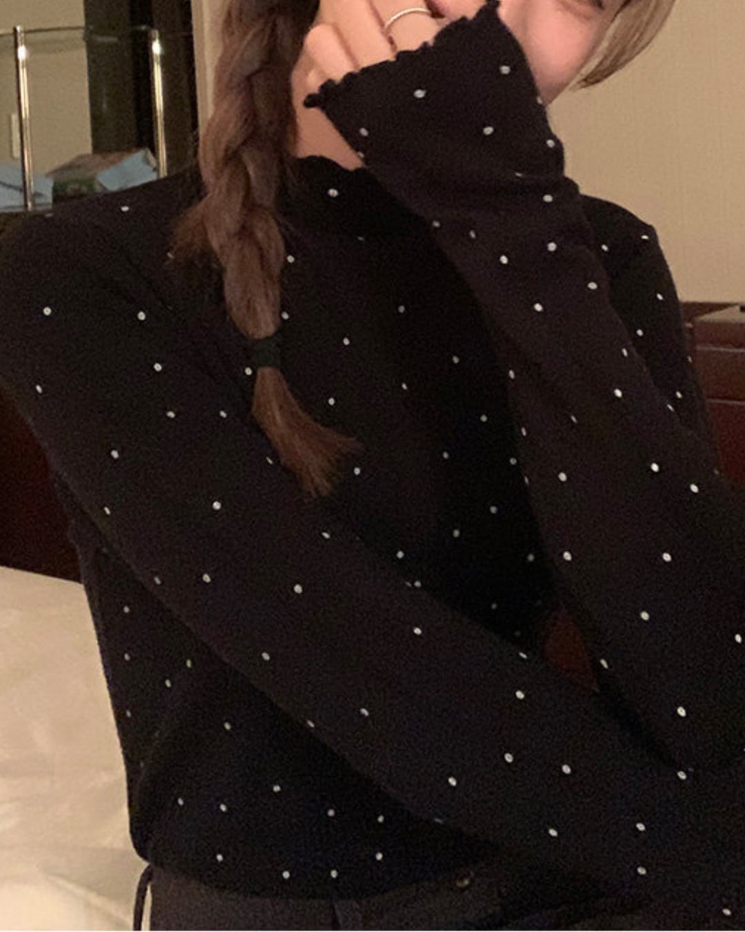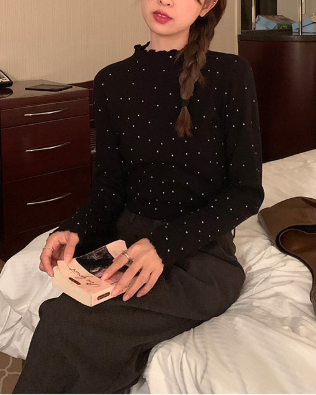 小さなドット柄が上品で大人可愛い印象を演出してくれるハイネックトップス。首元・袖口・裾にはさりげないメローフリルデザインを施し、シンプルながらも女性らしい柔らかさをプラス。程よくフィットするシルエットで、インナーとしても一枚着としても活躍します。きれいめパンツやスカートと合わせれば上品スタイルに、デニムと合わせればカジュアルダウンも楽しめる万能アイテムです。