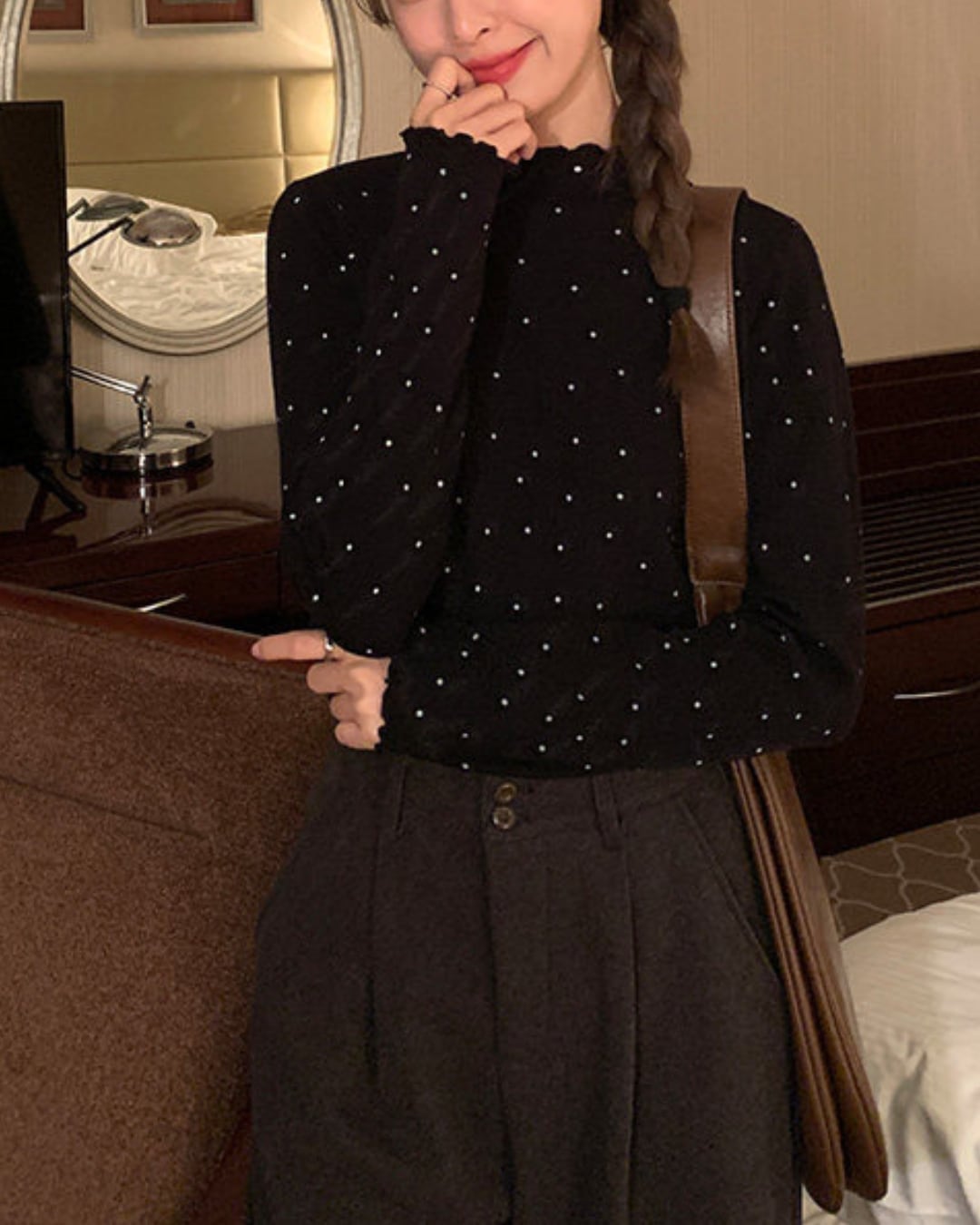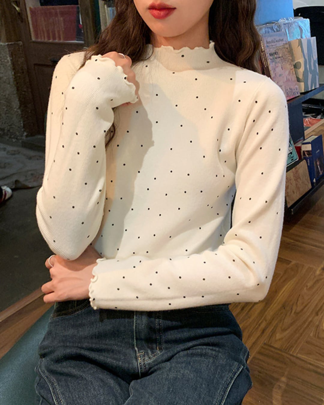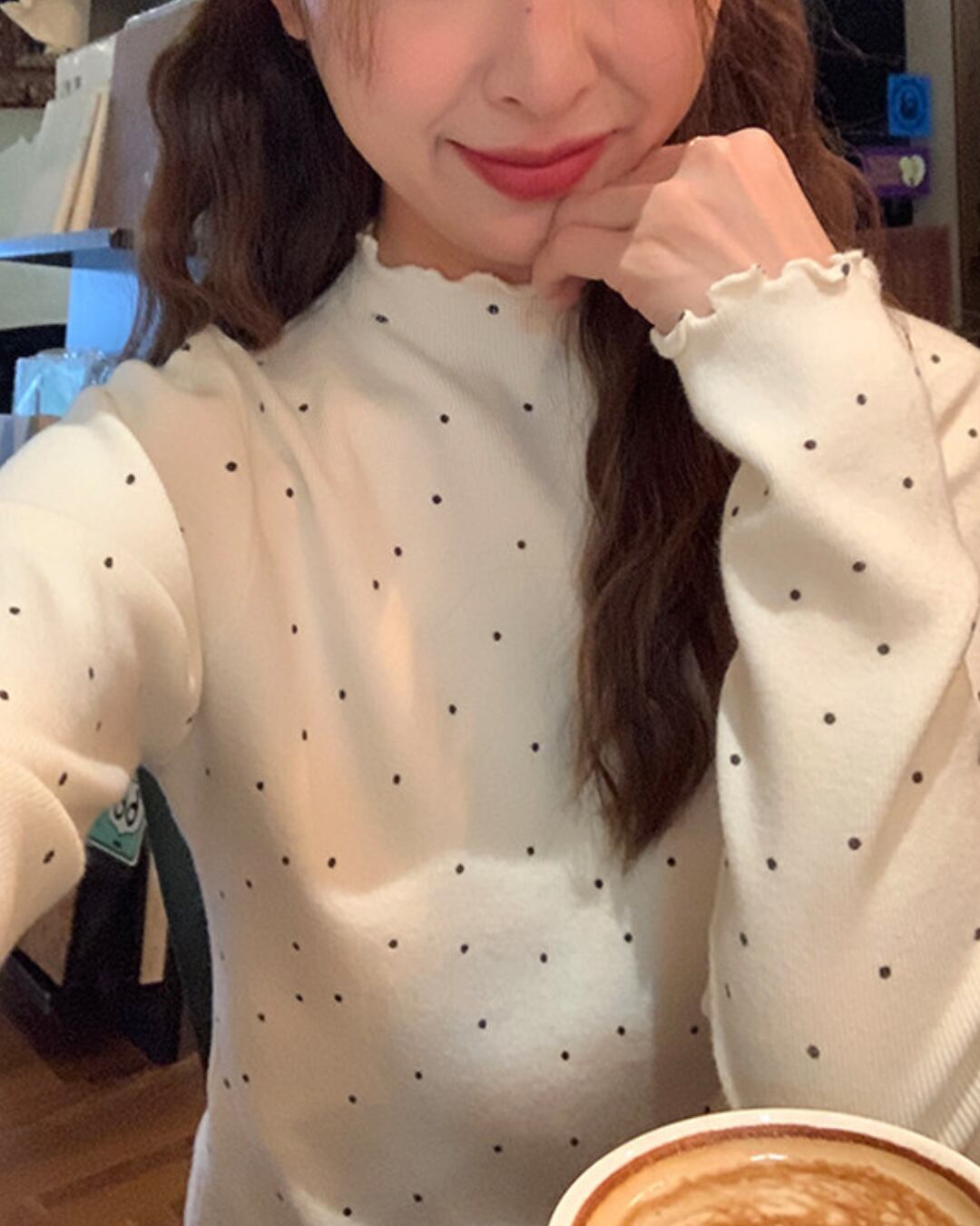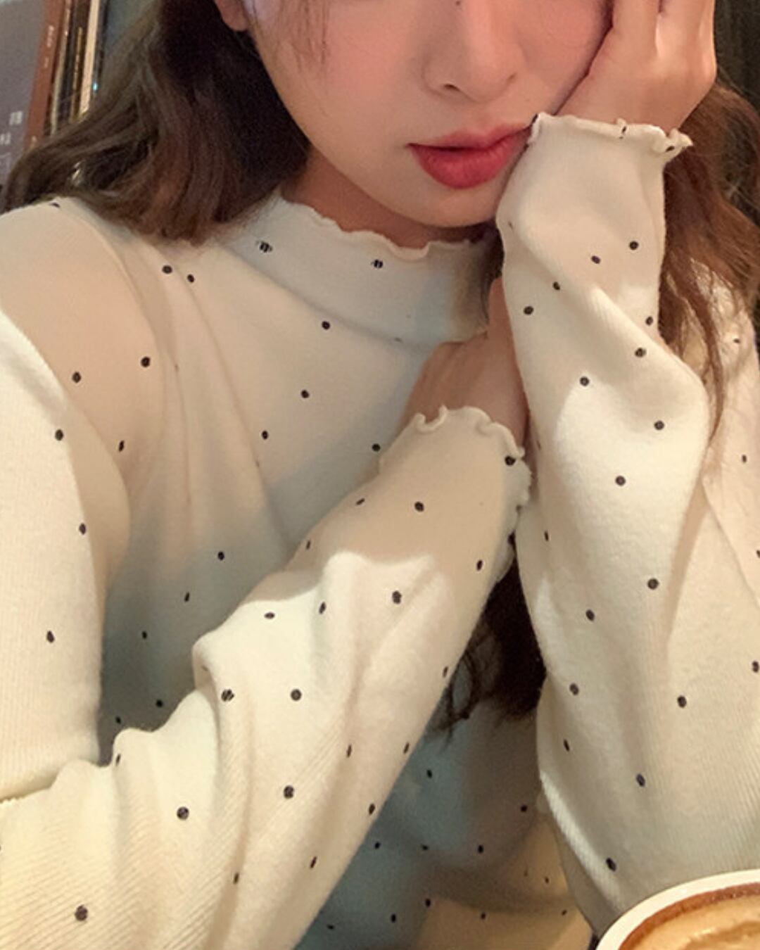 小さなドット柄が上品で大人可愛い印象を演出してくれるハイネックトップス。首元・袖口・裾にはさりげないメローフリルデザインを施し、シンプルながらも女性らしい柔らかさをプラス。程よくフィットするシルエットで、インナーとしても一枚着としても活躍します。きれいめパンツやスカートと合わせれば上品スタイルに、デニムと合わせればカジュアルダウンも楽しめる万能アイテムです。