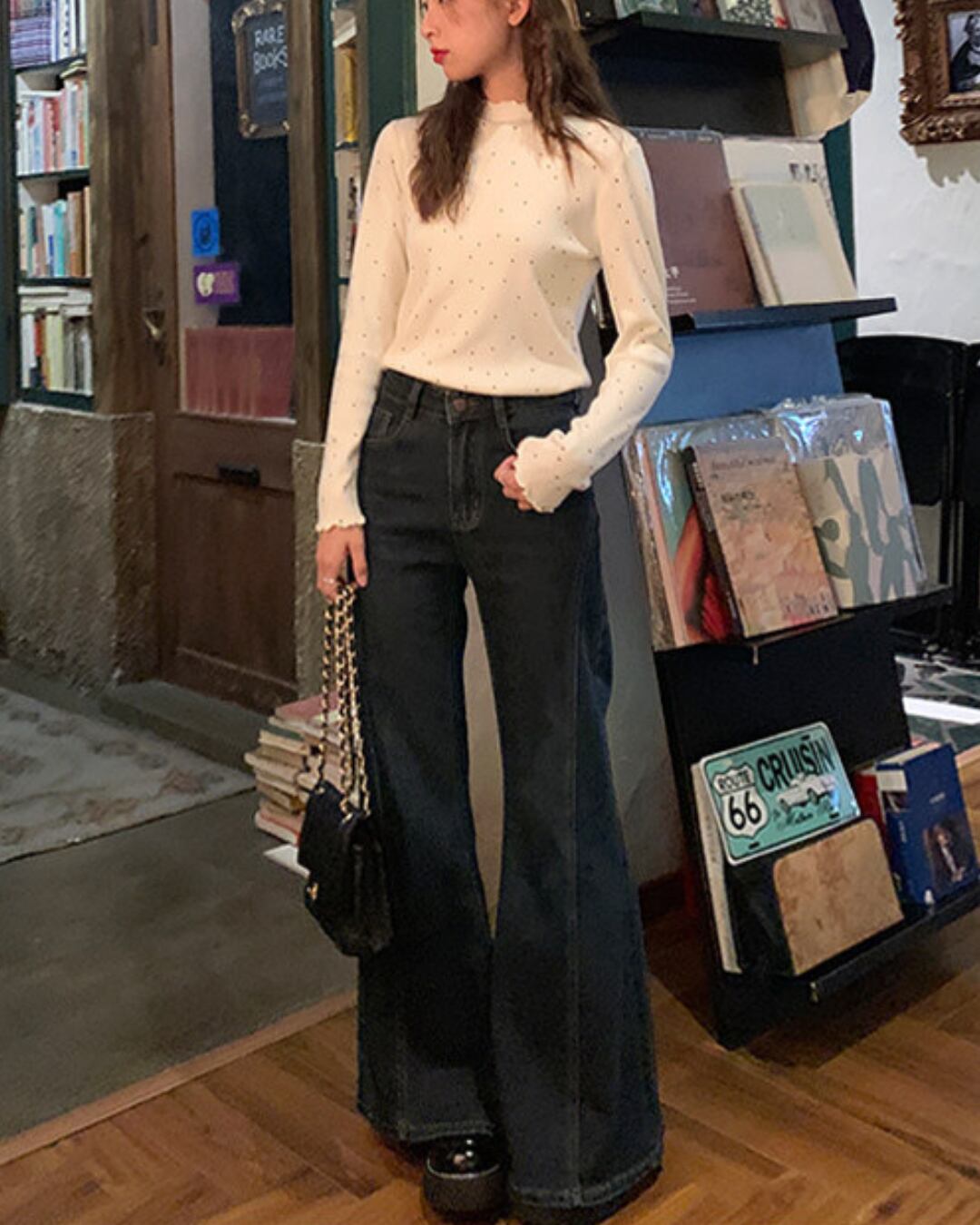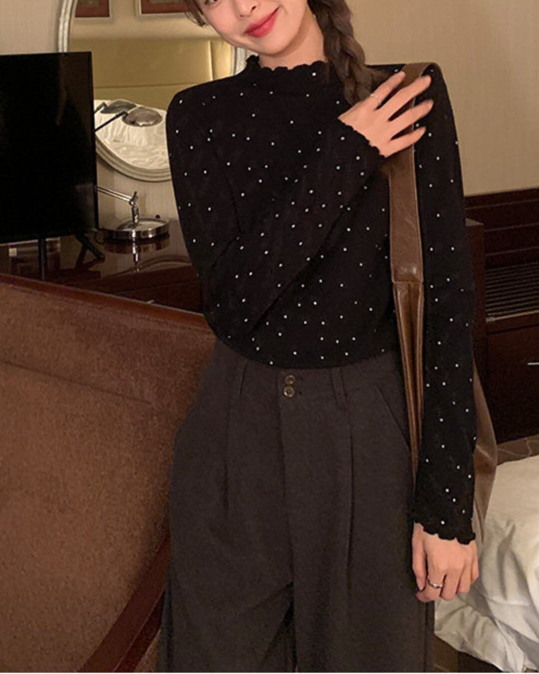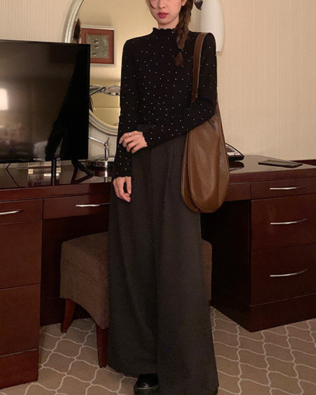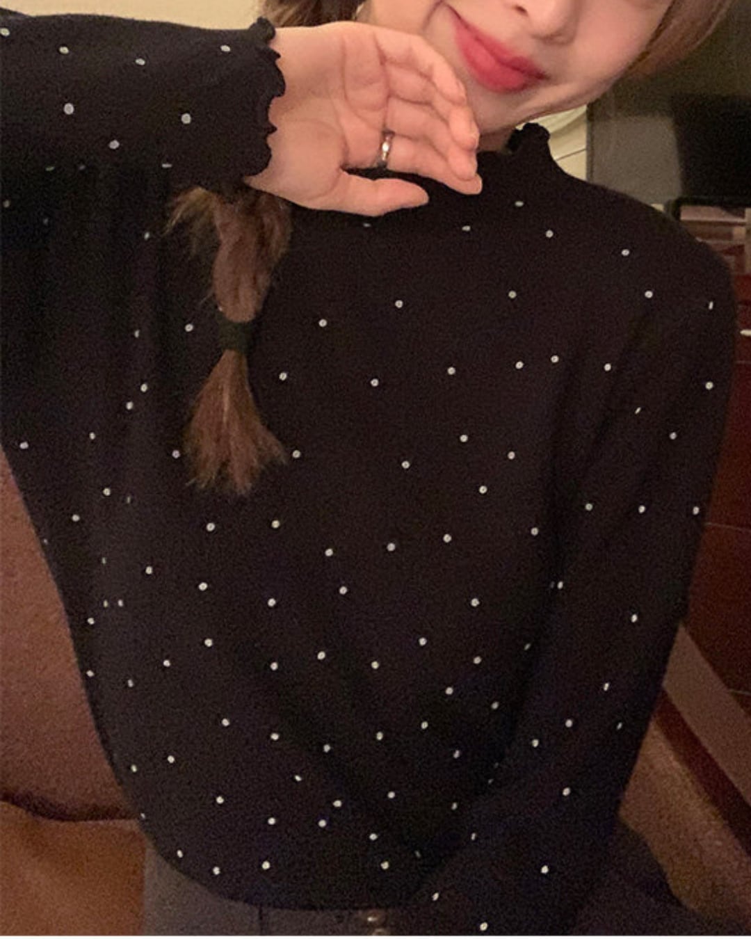 小さなドット柄が上品で大人可愛い印象を演出してくれるハイネックトップス。首元・袖口・裾にはさりげないメローフリルデザインを施し、シンプルながらも女性らしい柔らかさをプラス。程よくフィットするシルエットで、インナーとしても一枚着としても活躍します。きれいめパンツやスカートと合わせれば上品スタイルに、デニムと合わせればカジュアルダウンも楽しめる万能アイテムです。