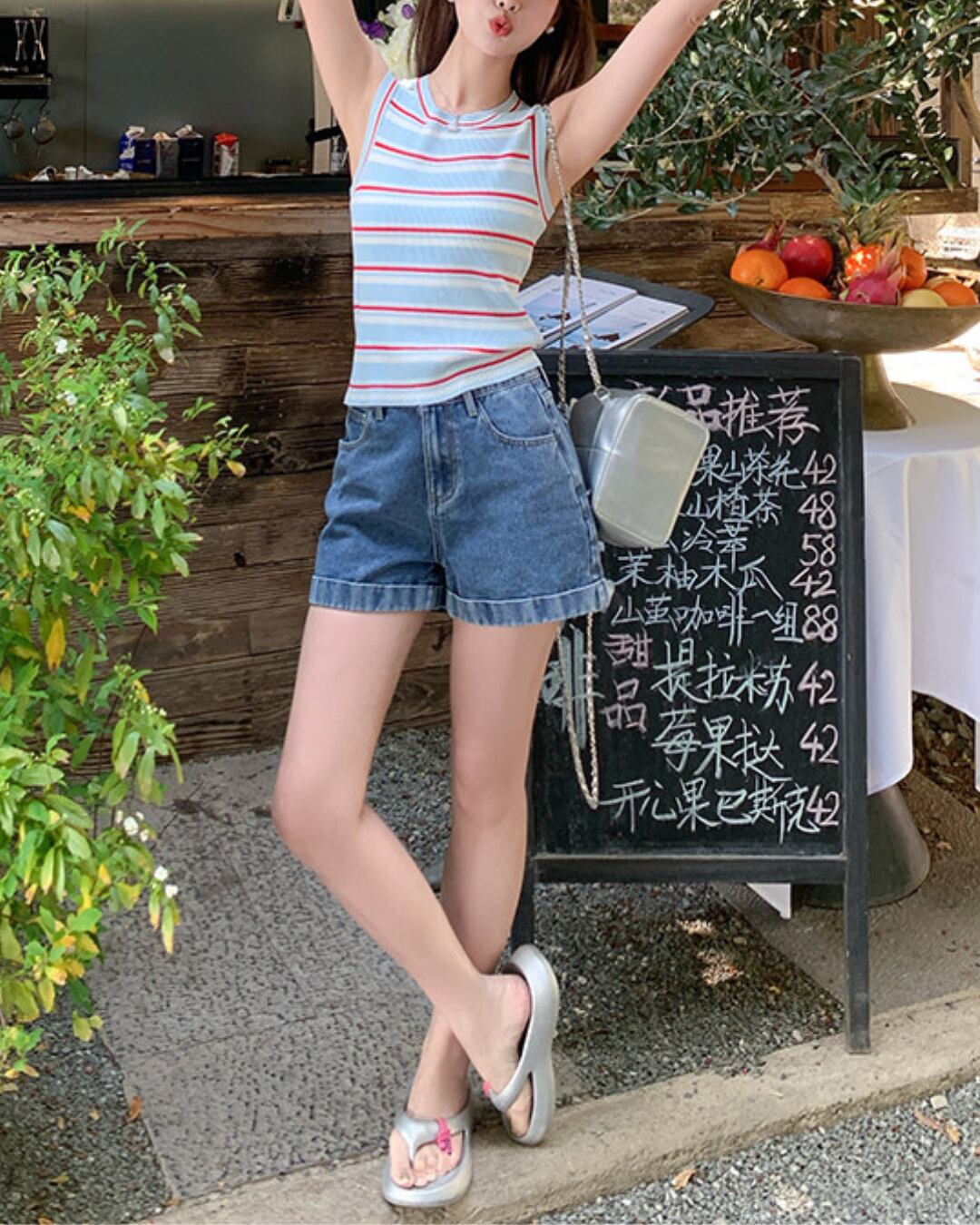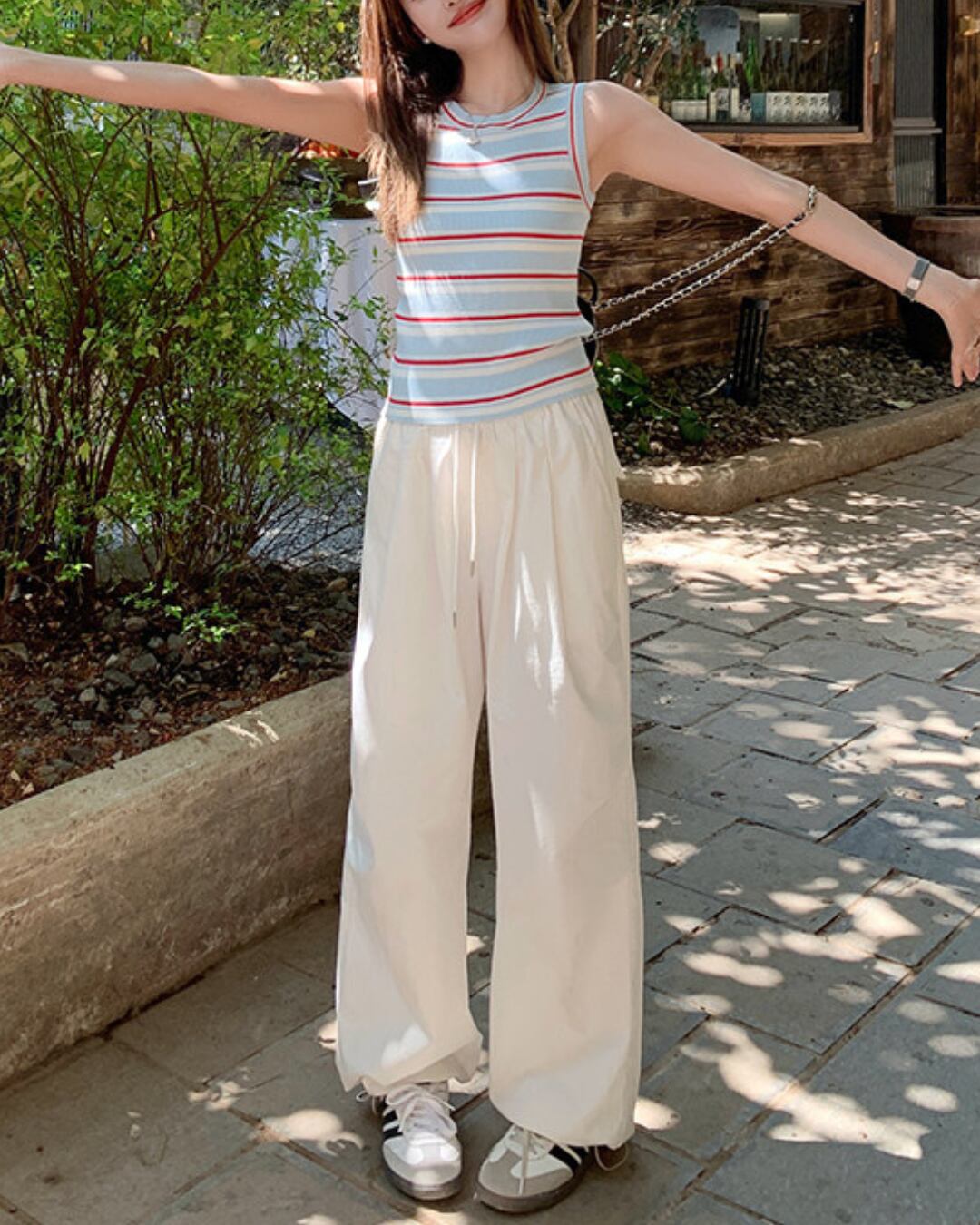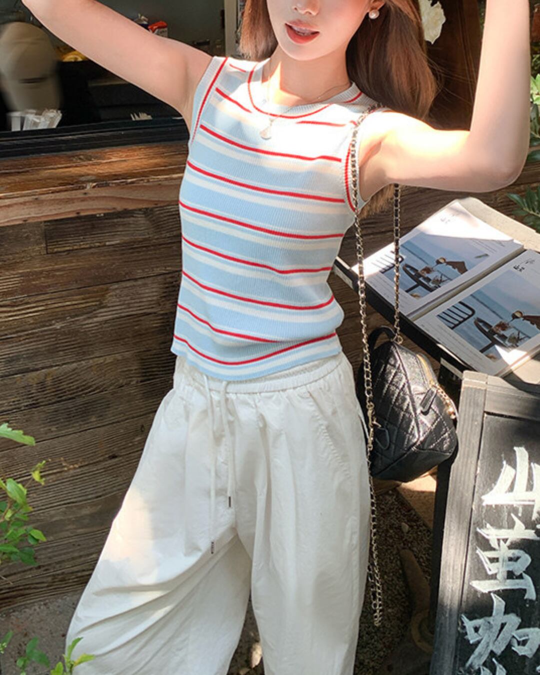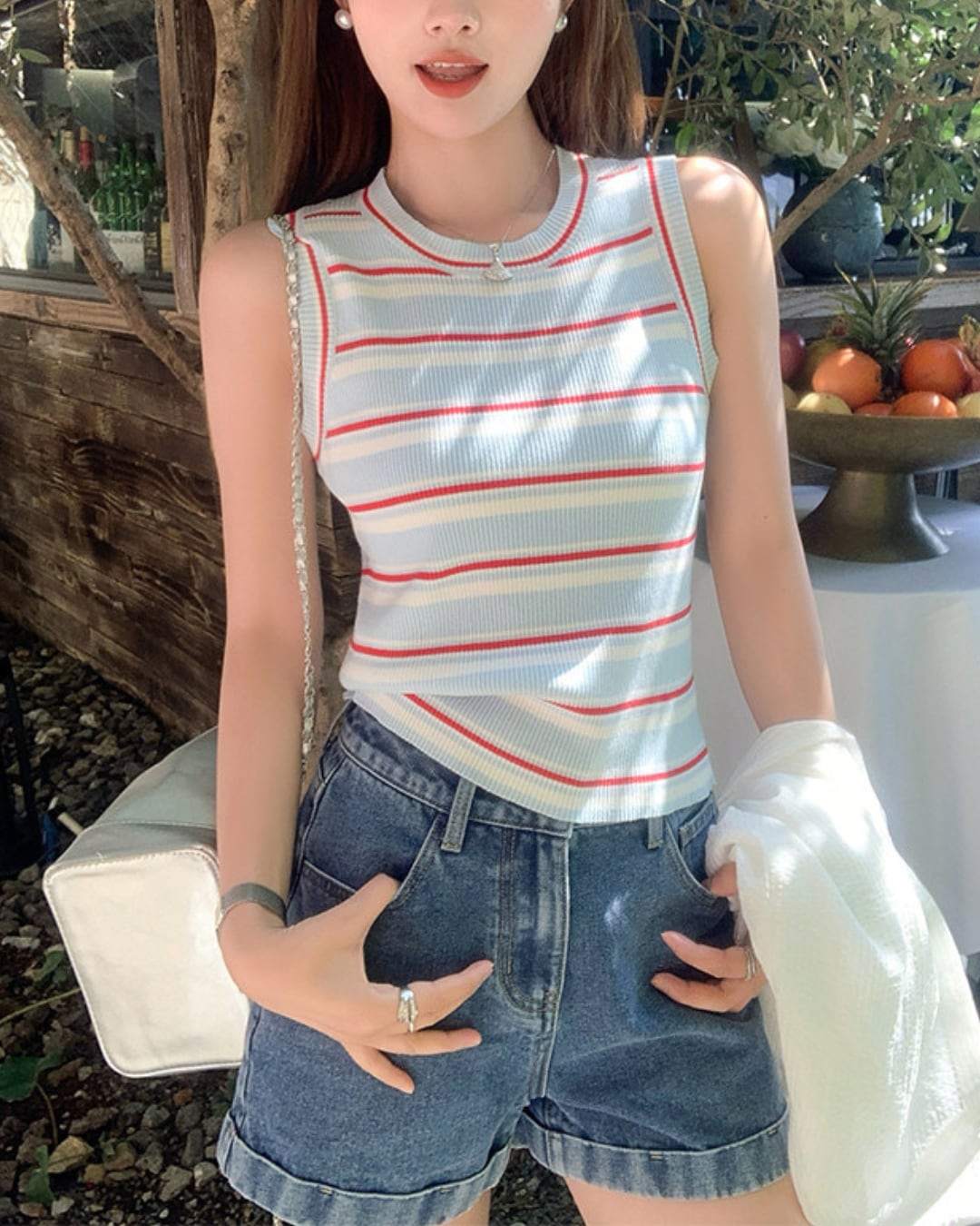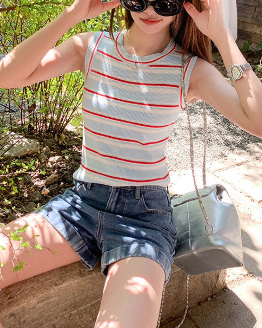 #ボーダートップス #リブニット #タンクトップ #夏コーデ #カジュアルスタイル #ブルーコーデ