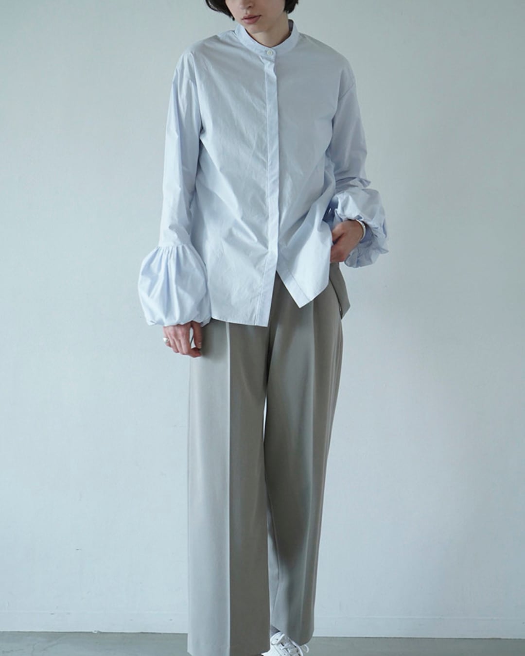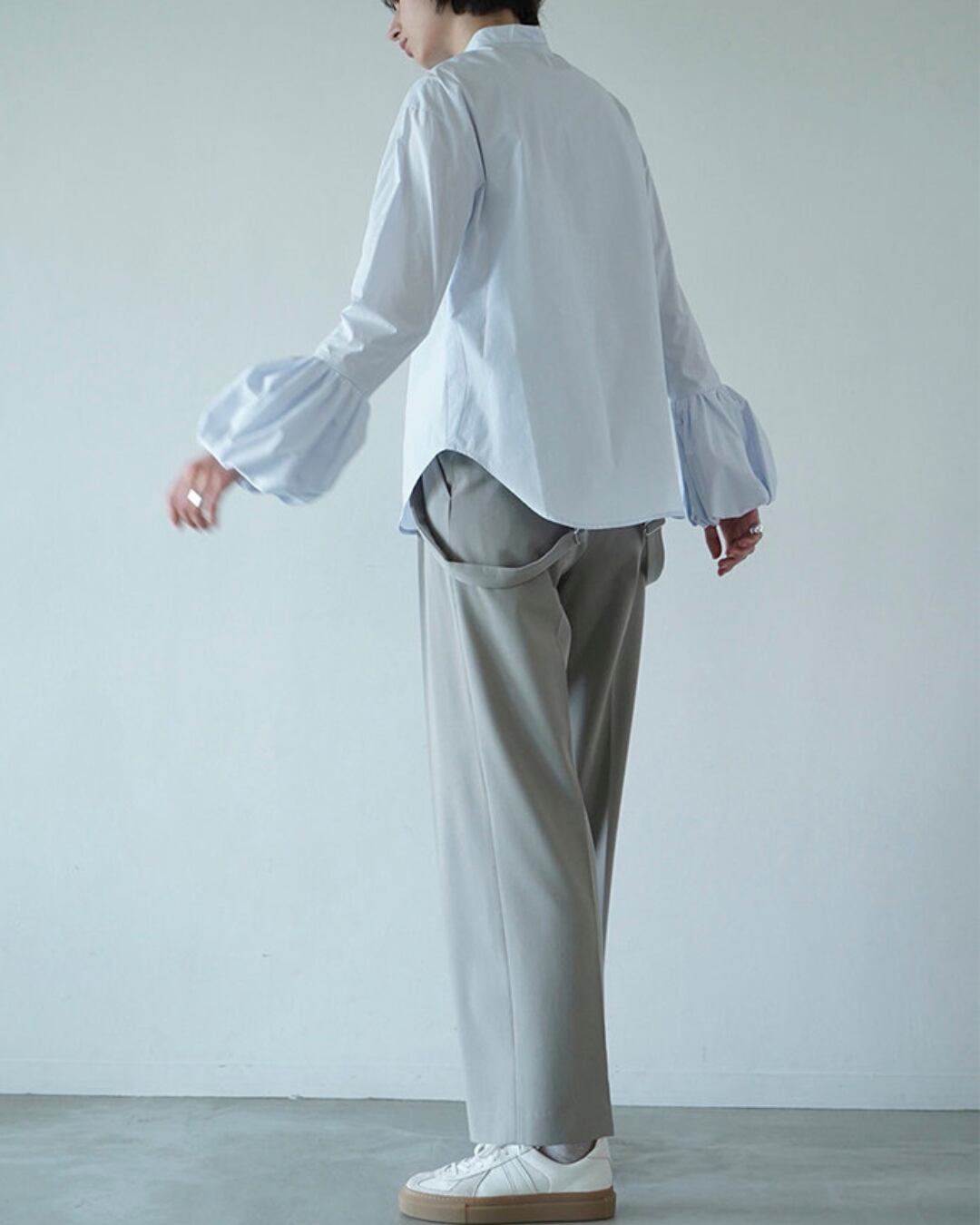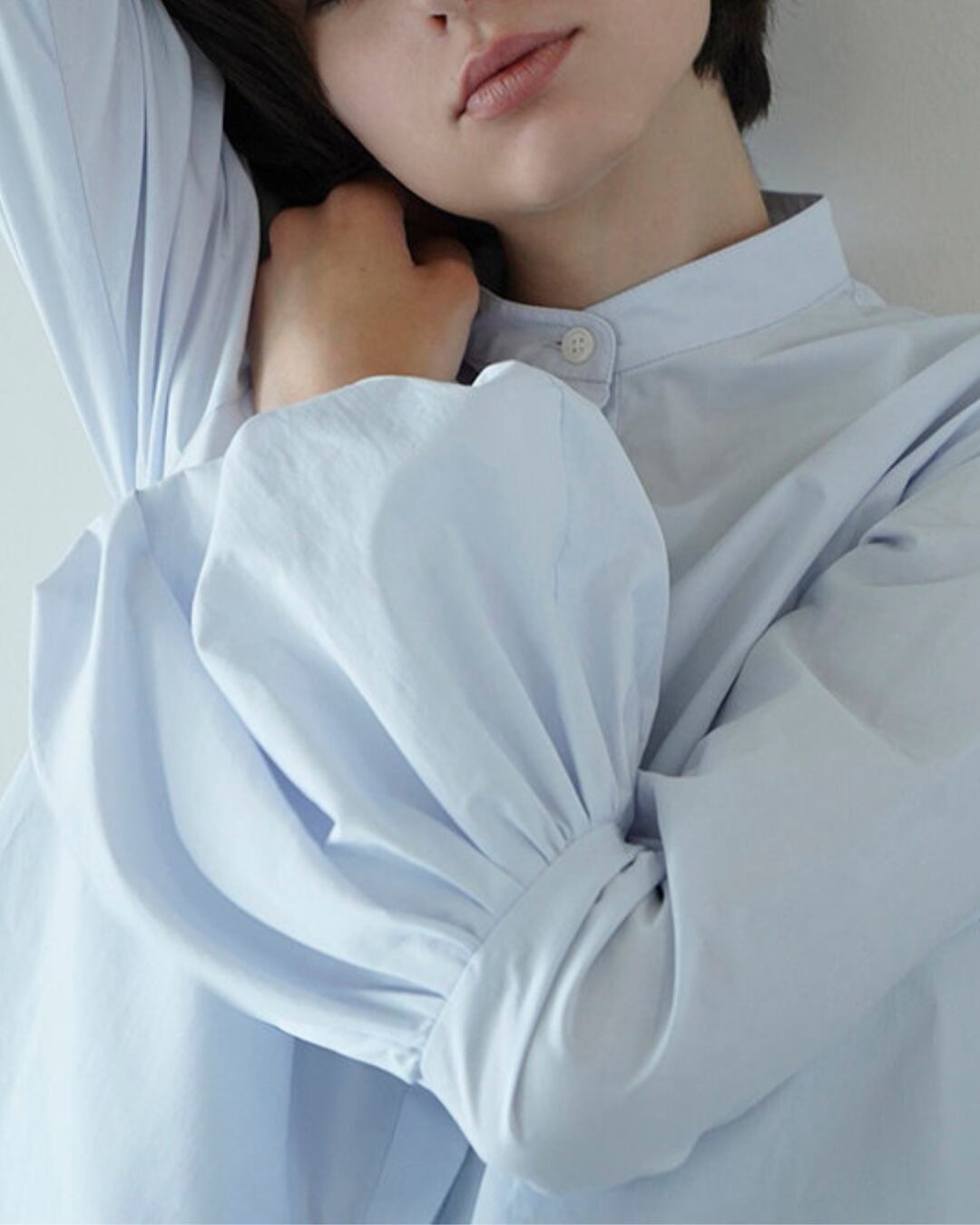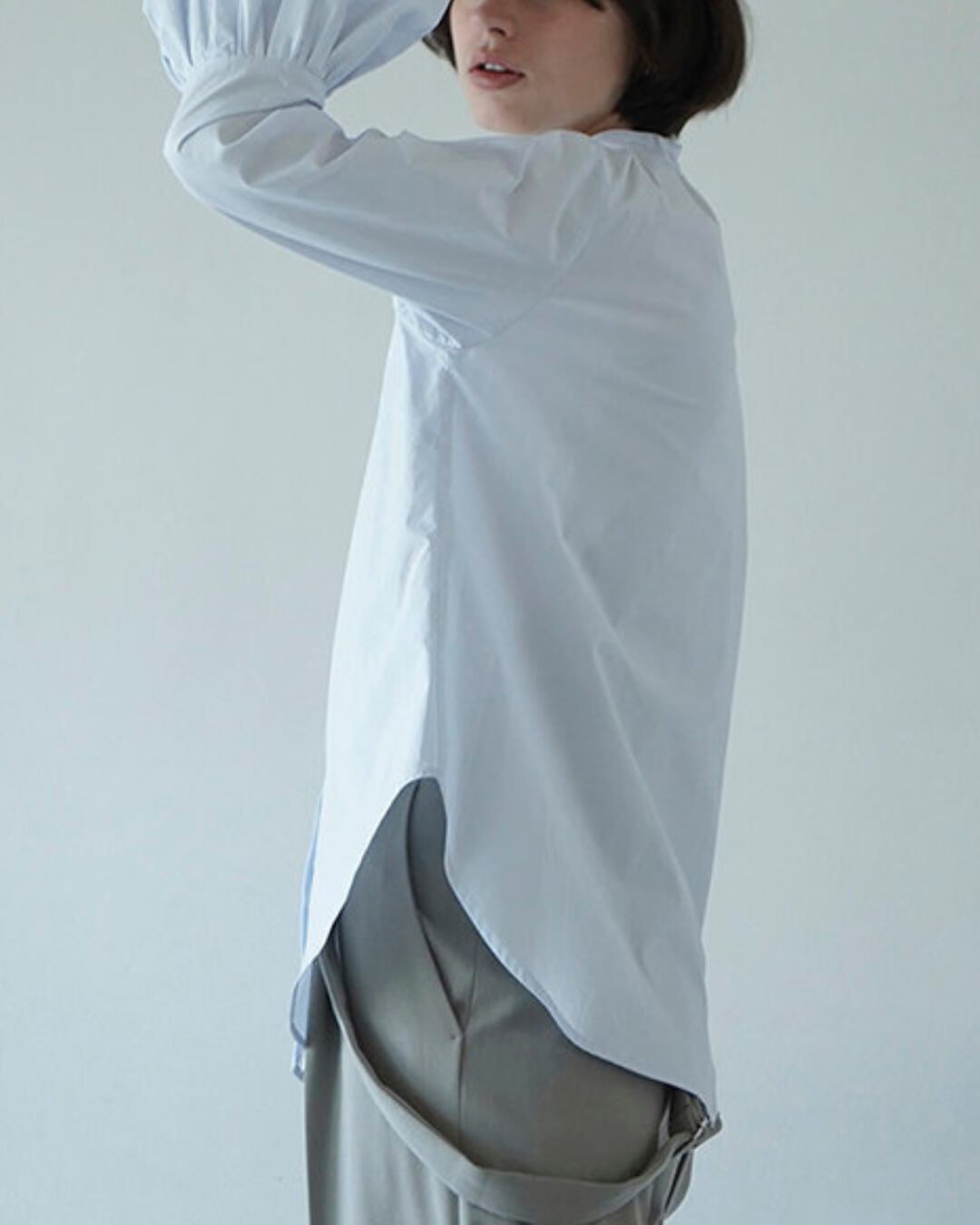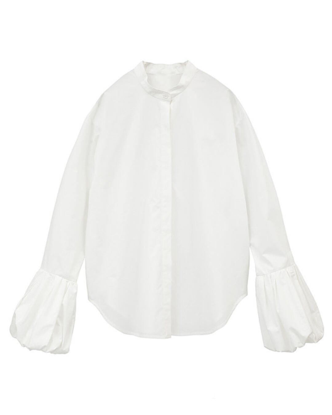 ボリューム感のあるバルーンスリーブが目を惹くコットンブラウス。程よくハリのある素材感で、シンプルながらも存在感のある一枚です。スタンドカラーと比翼仕立てのフロントデザインが、甘くなりすぎず上品な印象に。ゆったりとしたシルエットで、タックイン・アウトどちらでもバランス良く着用していただけます。デイリーからオフィススタイルまで幅広く活躍するアイテムです。