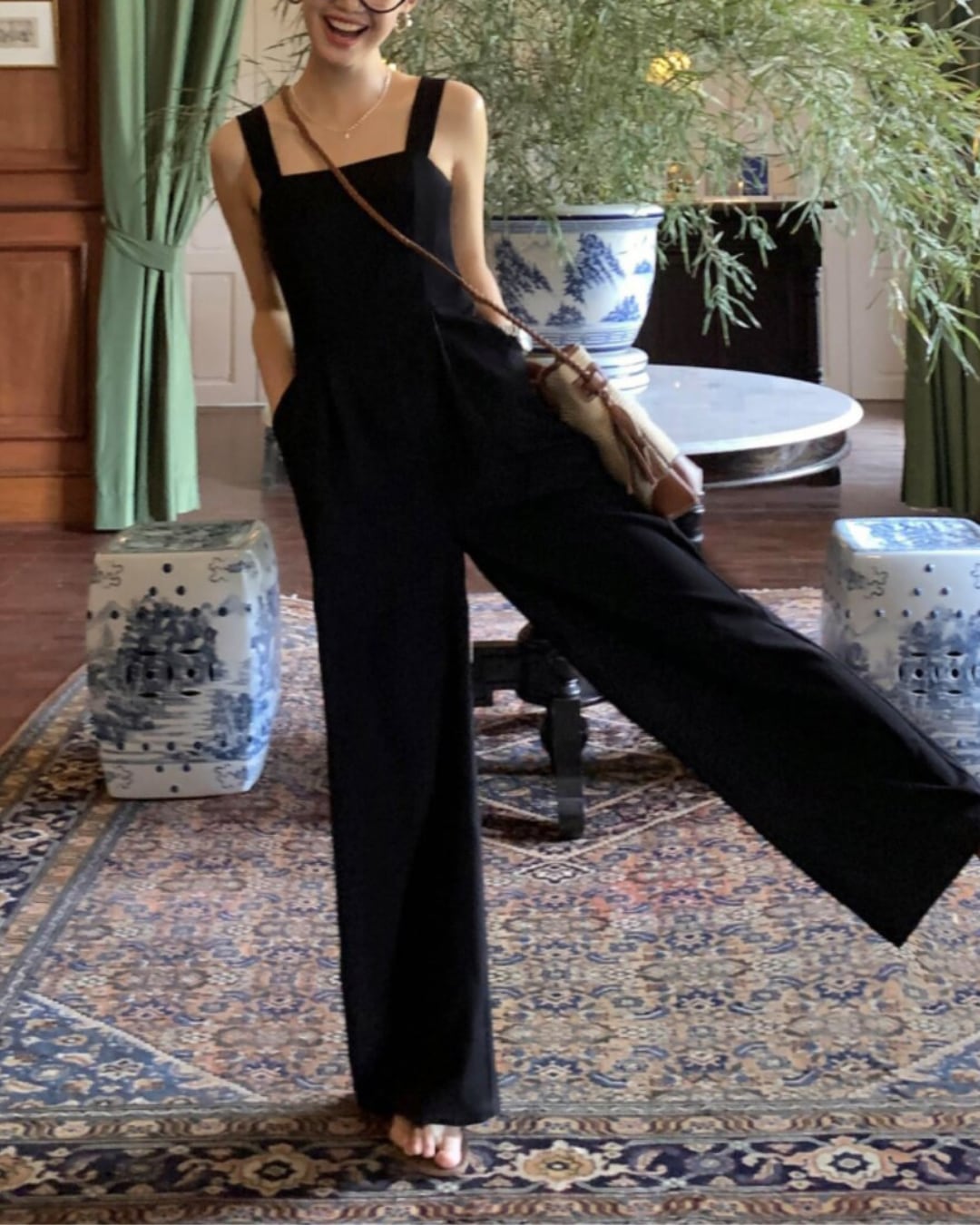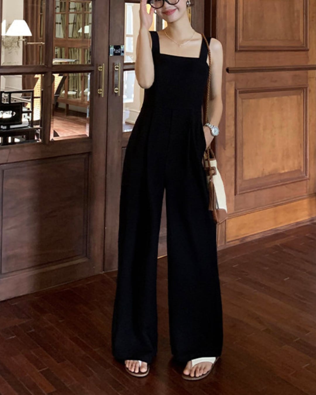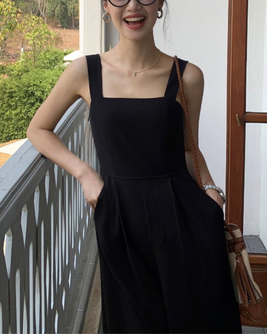 洗練されたシルエットが魅力のブラックオールインワン。すっきりとしたスクエアネックと程よく太めのストラップが上品な印象を演出します。ウエスト切替デザインでスタイルアップ効果があり、裾に向かって広がるワイドシルエットが美脚ラインを叶える一着。サイドファスナー仕様で着脱しやすく、バックはシャーリングデザインで程よくフィット。裏地付きで安心感のある着心地です。きれいめにもカジュアルにも着回せる、大人のためのブラックアイテムです。