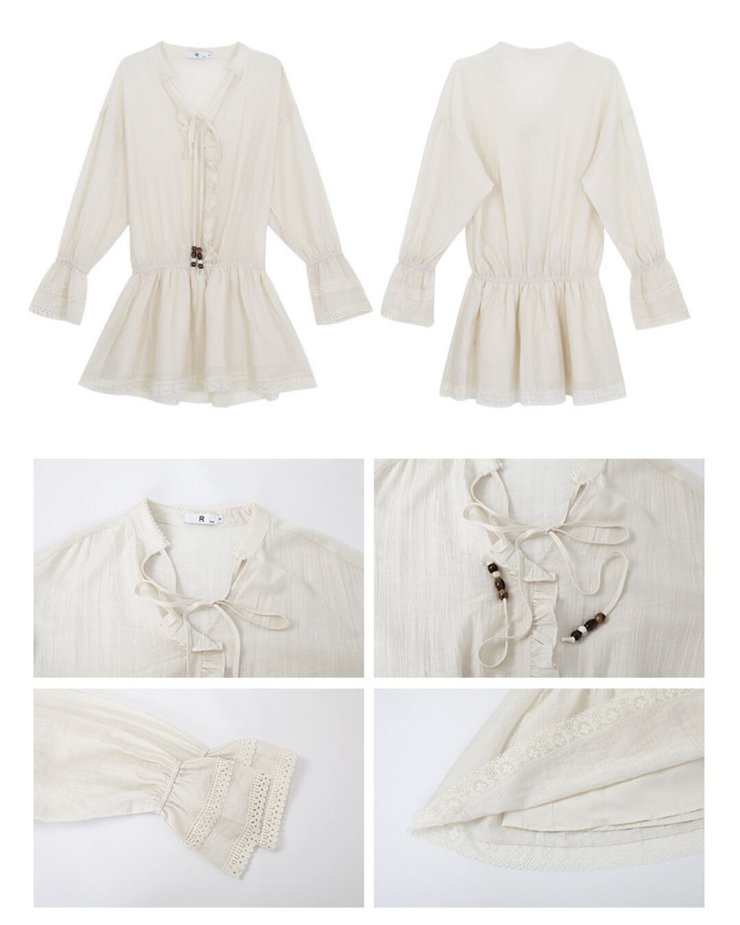 フロントのフリルデザインとリボンがポイントのミニワンピース。やわらかい風合いの生地に、袖口と裾のレースが女性らしい印象を演出します。ウエスト切り替えのギャザーデザインで、ふんわりとしたシルエットが魅力の一着。1枚でコーディネートが完成する、ナチュラルでフェミニンなワンピースです。